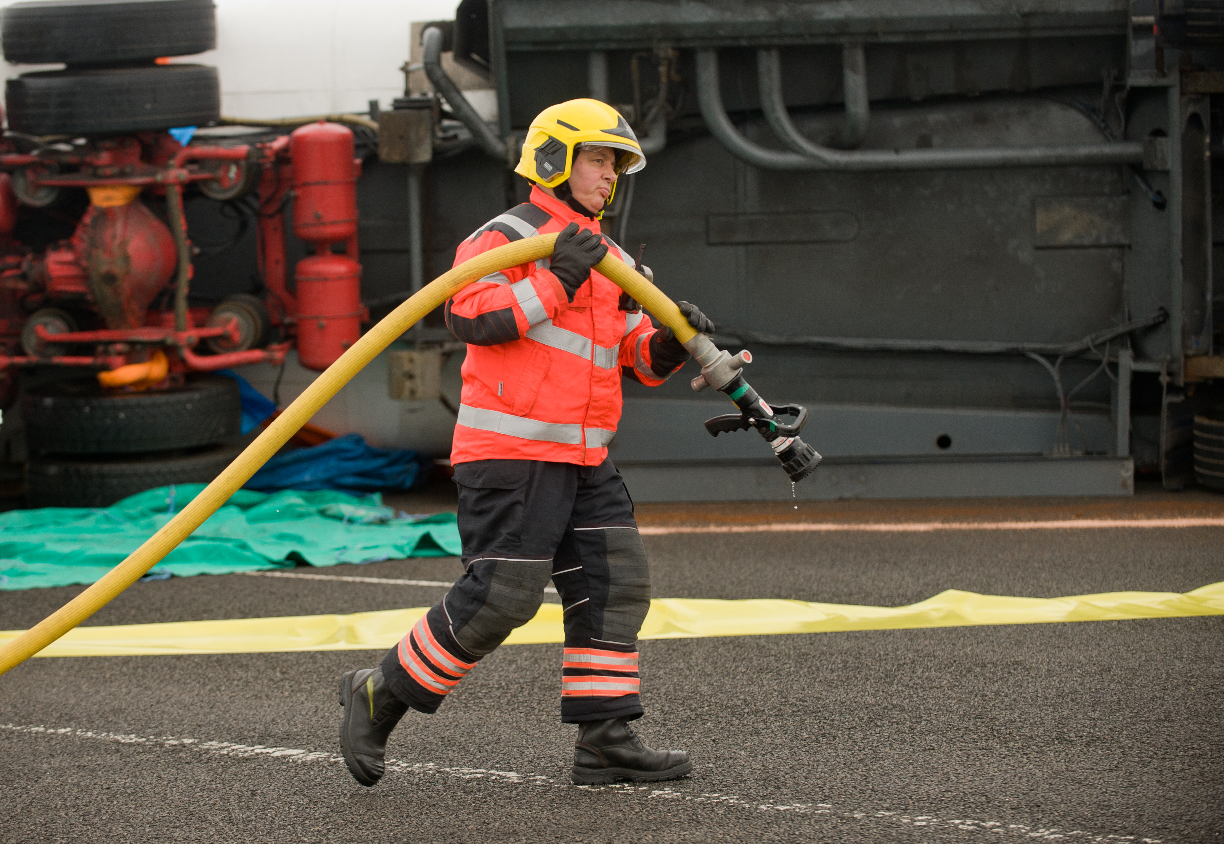 ? Si Barber 07739 472 922 Cambridge constabulary, firefighters and emergency services conducting an exercise of dealing with a chemical accident and spillage. Picture shows: Firefighter with hose.