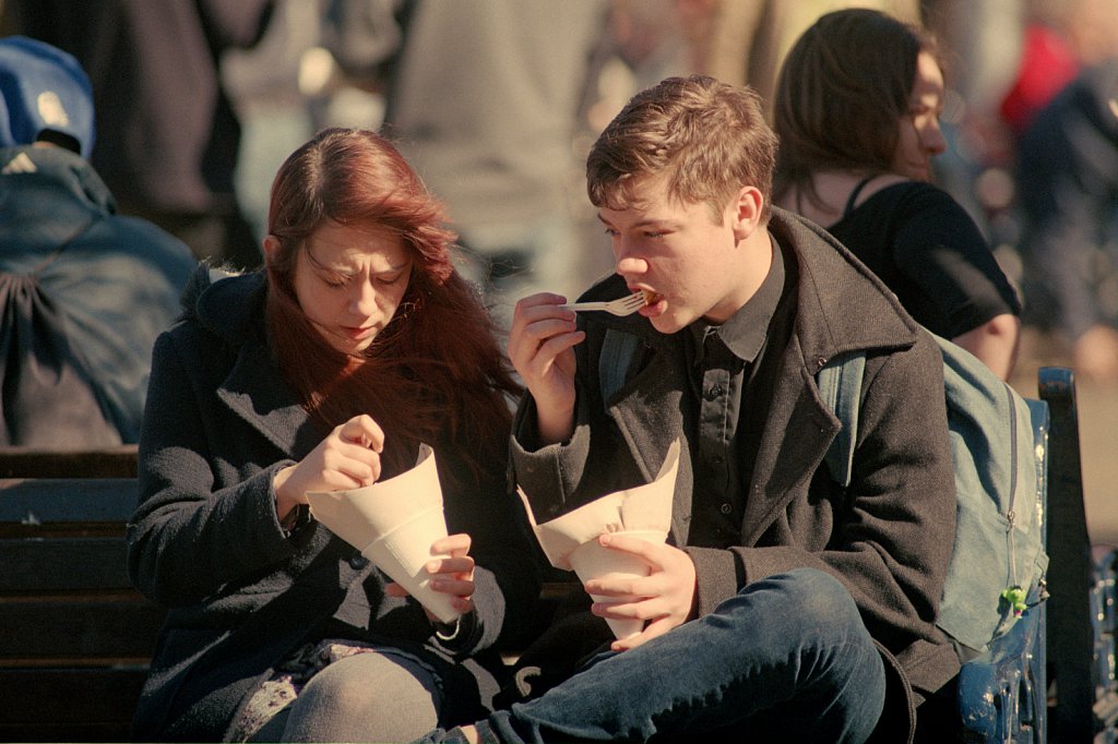 ©Si Barber Moral rights asserted. Young couple eating chips in Great Yarmouth, Norfolk,UK