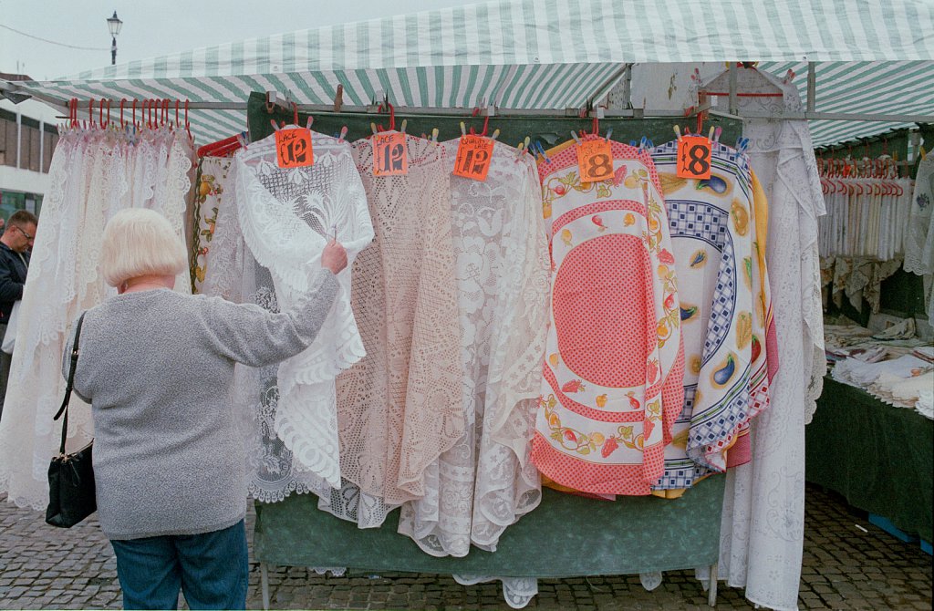 ©Si Barber Moral rights asserted. Lace for sale on Great Yarmouth Market, Norfolk, UK.