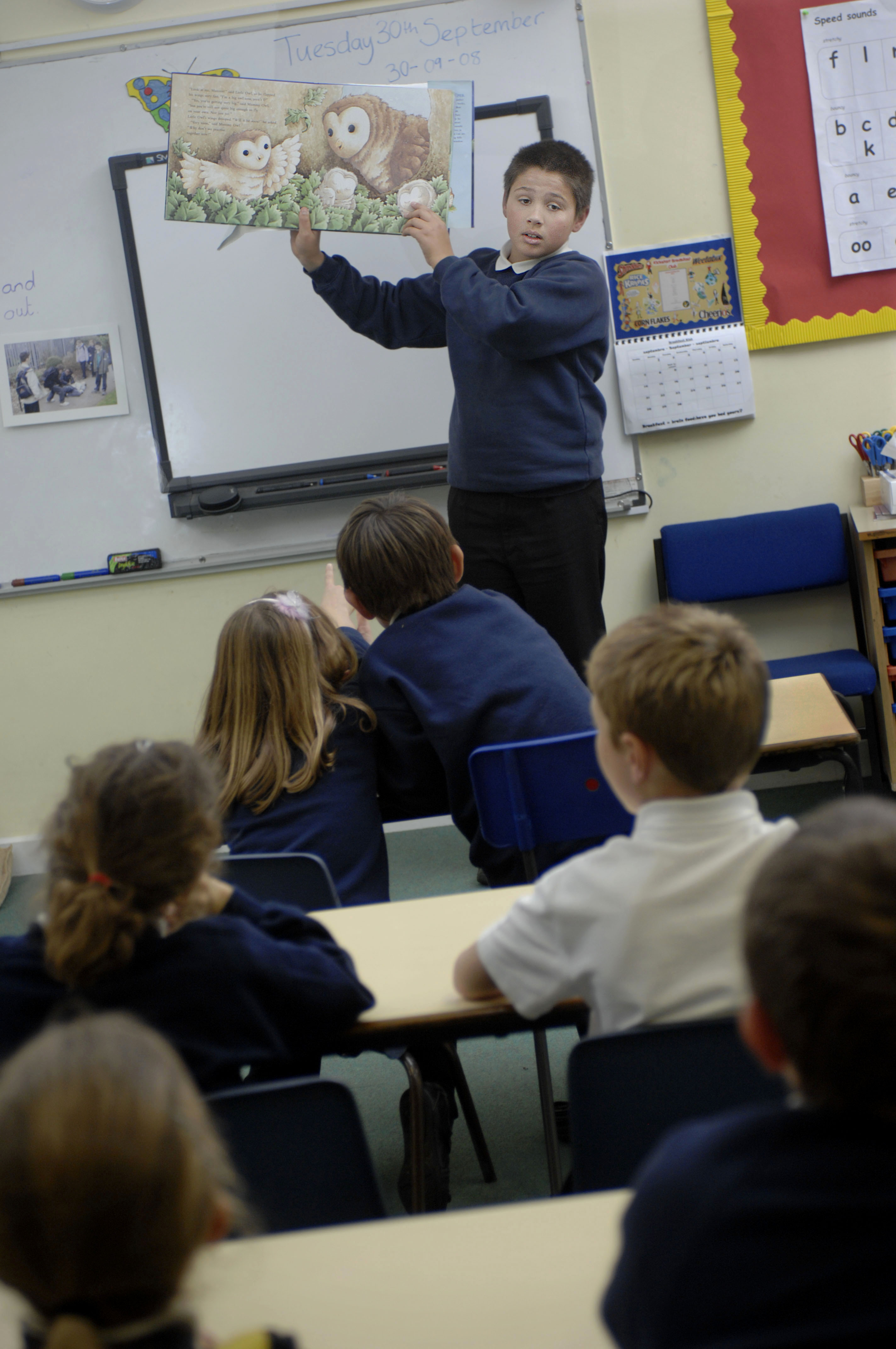 PHOTOGRAPHER - Si Barber 07739 472 922 COMMISSIONED 300908 -CHARLOTTE MAGUIRE Children of St Peter and St Paul primary school, Carbrooke,Norfolk interviewing and testing their classmates as they take over the school for a day and appoint their own teachers. Pic shows Richard teaching after sucessfully applying to become a teacher.