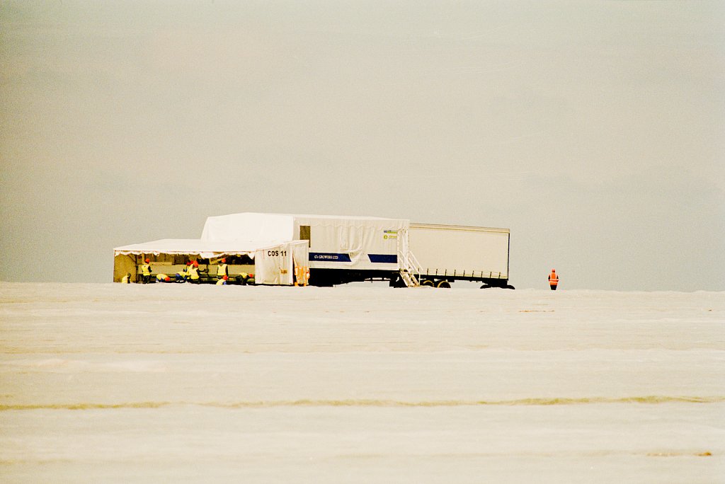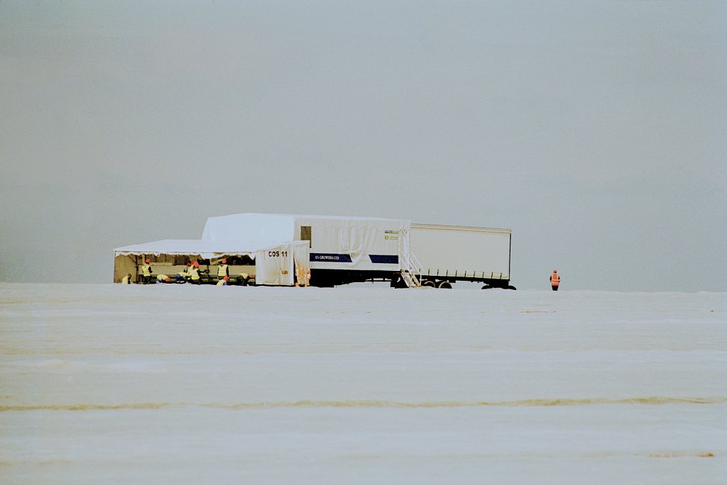 A 'walking' harvester picking lettuce amongst fields covered with polythene to protect crops from frost,Norfolk,UK.