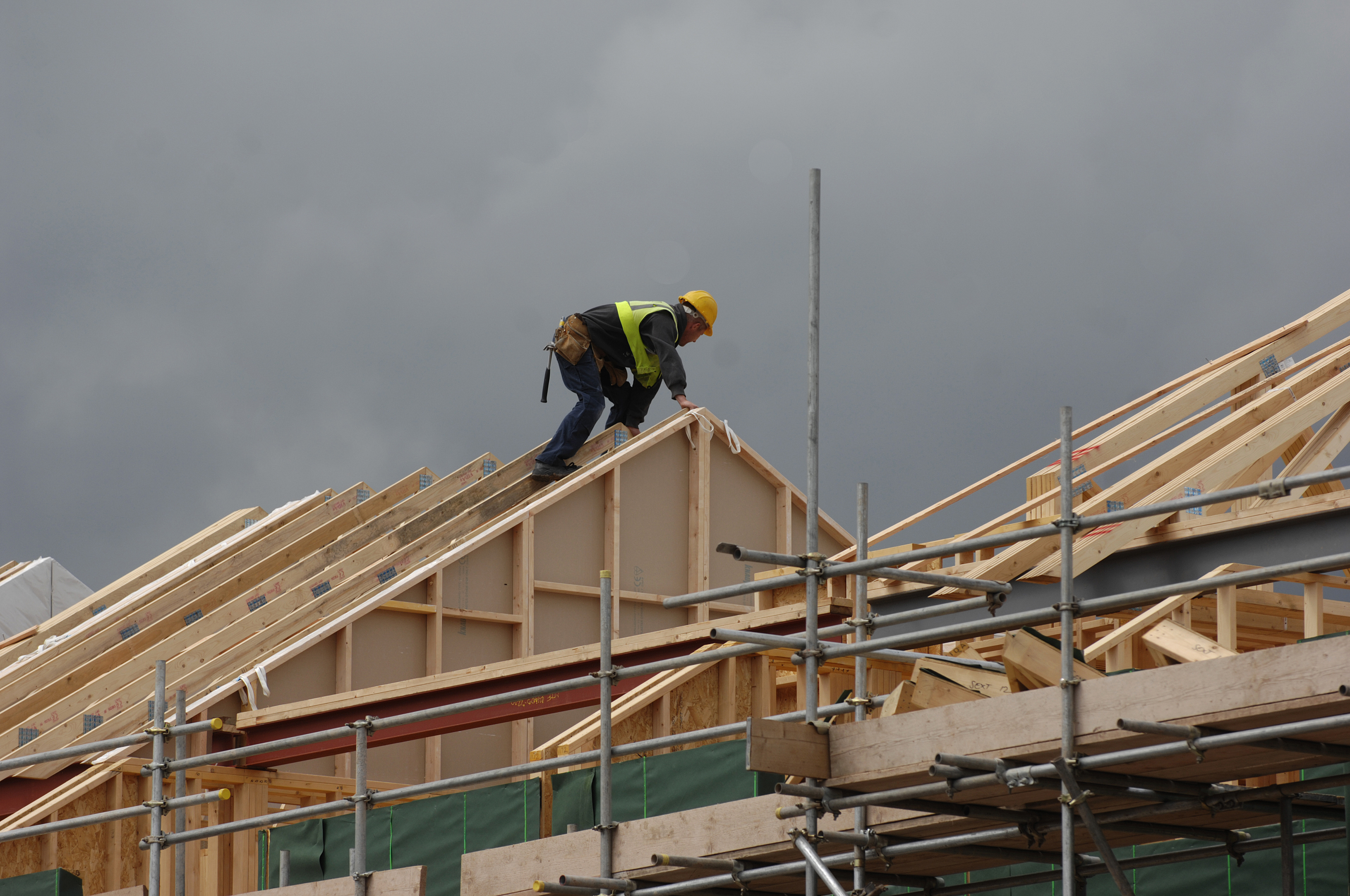 a house builder climbing onto the gable ends of a house beneath a stormy sky.