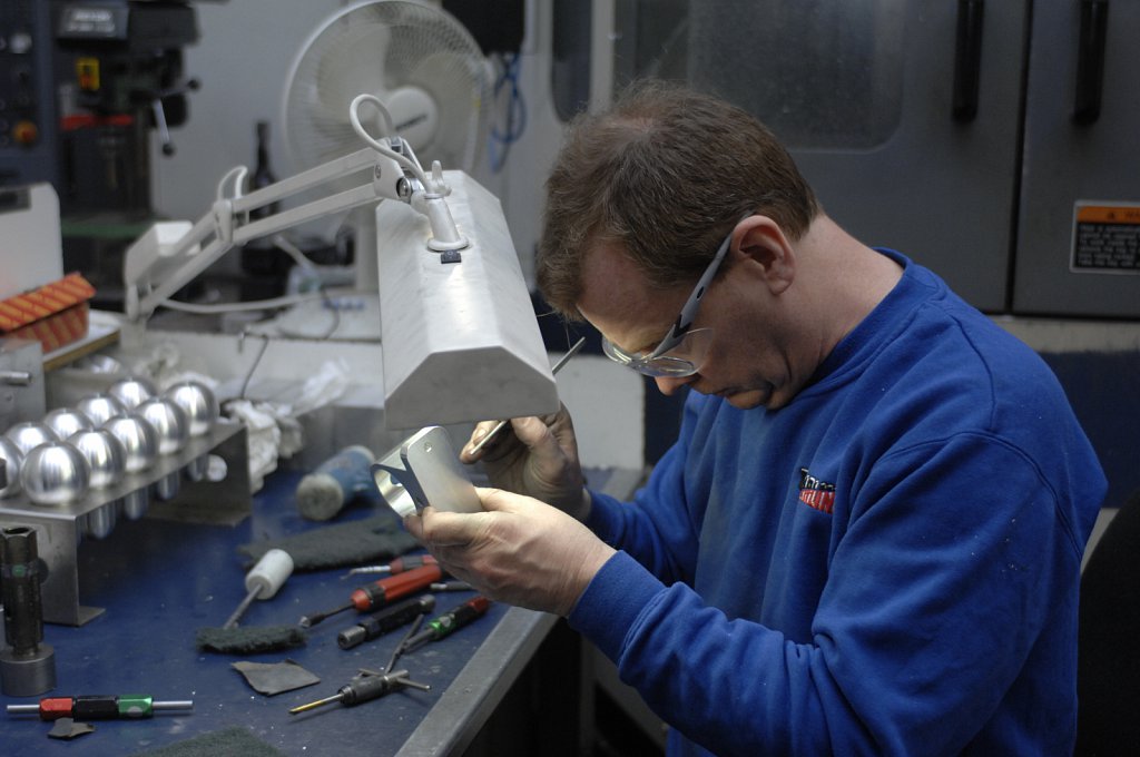 A worker dropping metal items into a rumble tank for cleaning. In the tank are small pieces of stone which rub against the metal a…