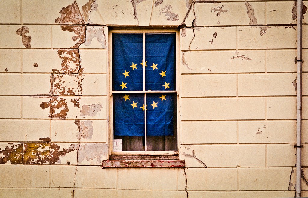 An EU flag hangs in the window of a dilapdated building in King’s Lynn, Norfolk, UK