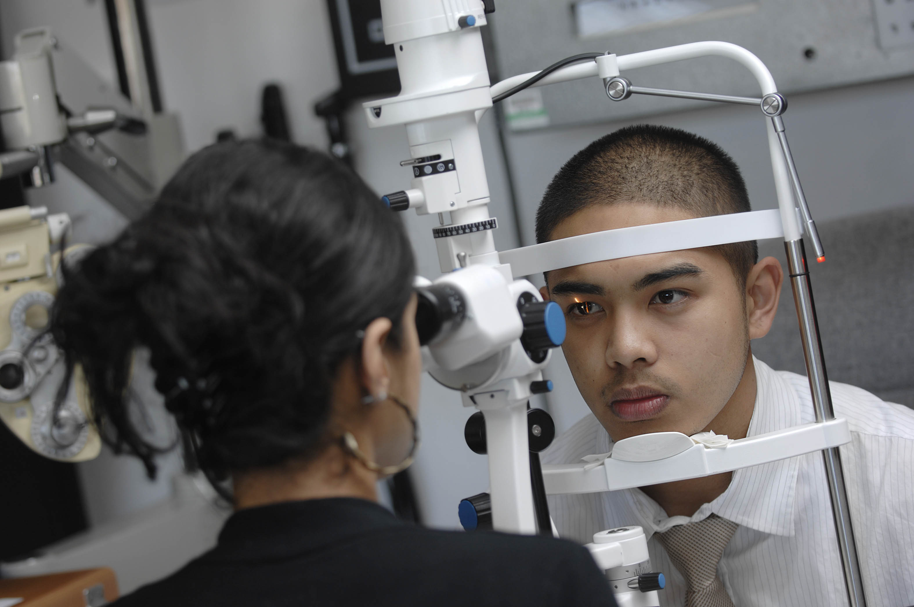 Pic by Si Barber - 07739 472 922 Audiometry and optometry students from the College of West Anglia in Cambridge. Image shows students practising eye exams. JO RUCK.