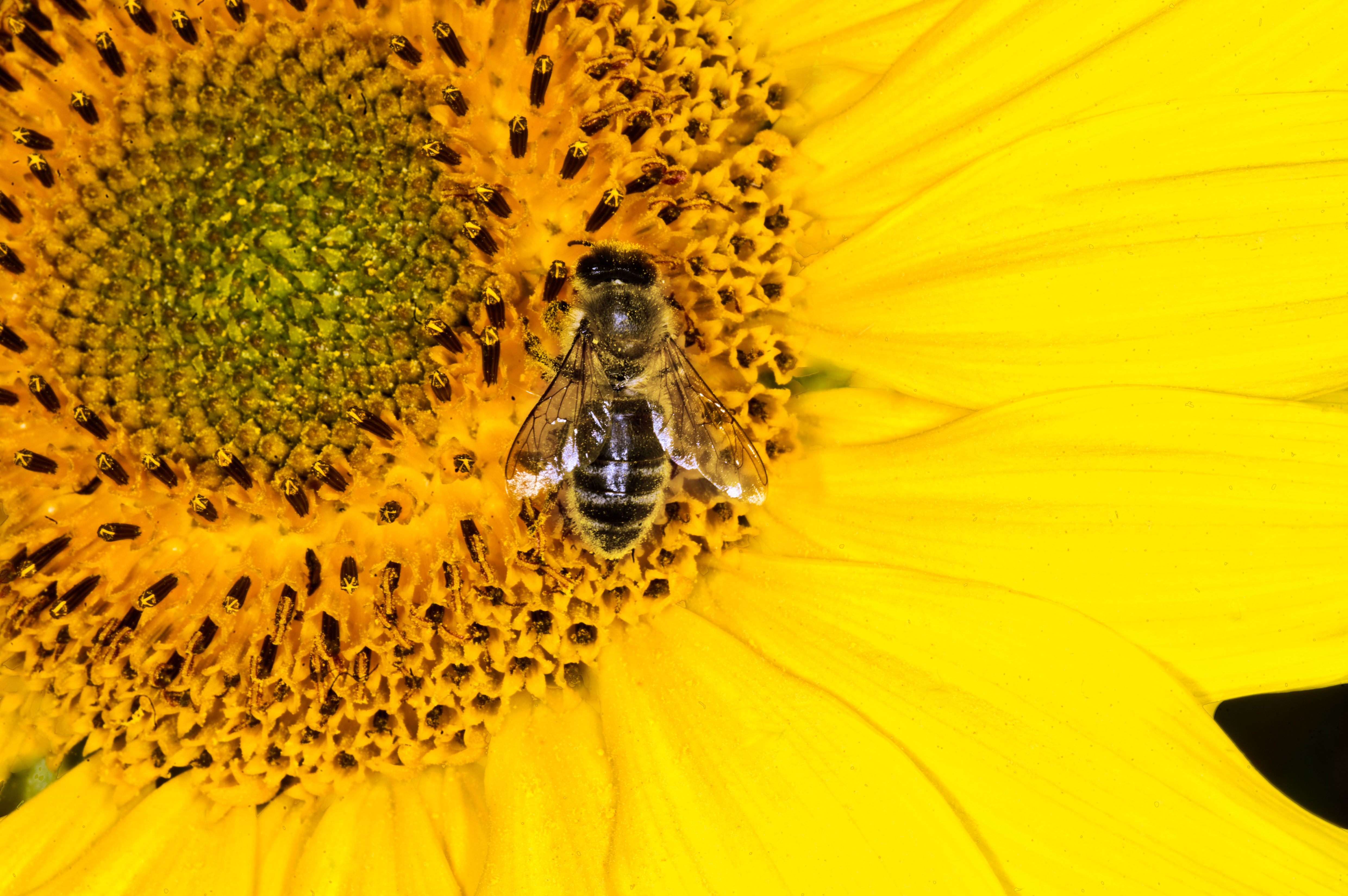 Bees harvesting pollen from sunflowers