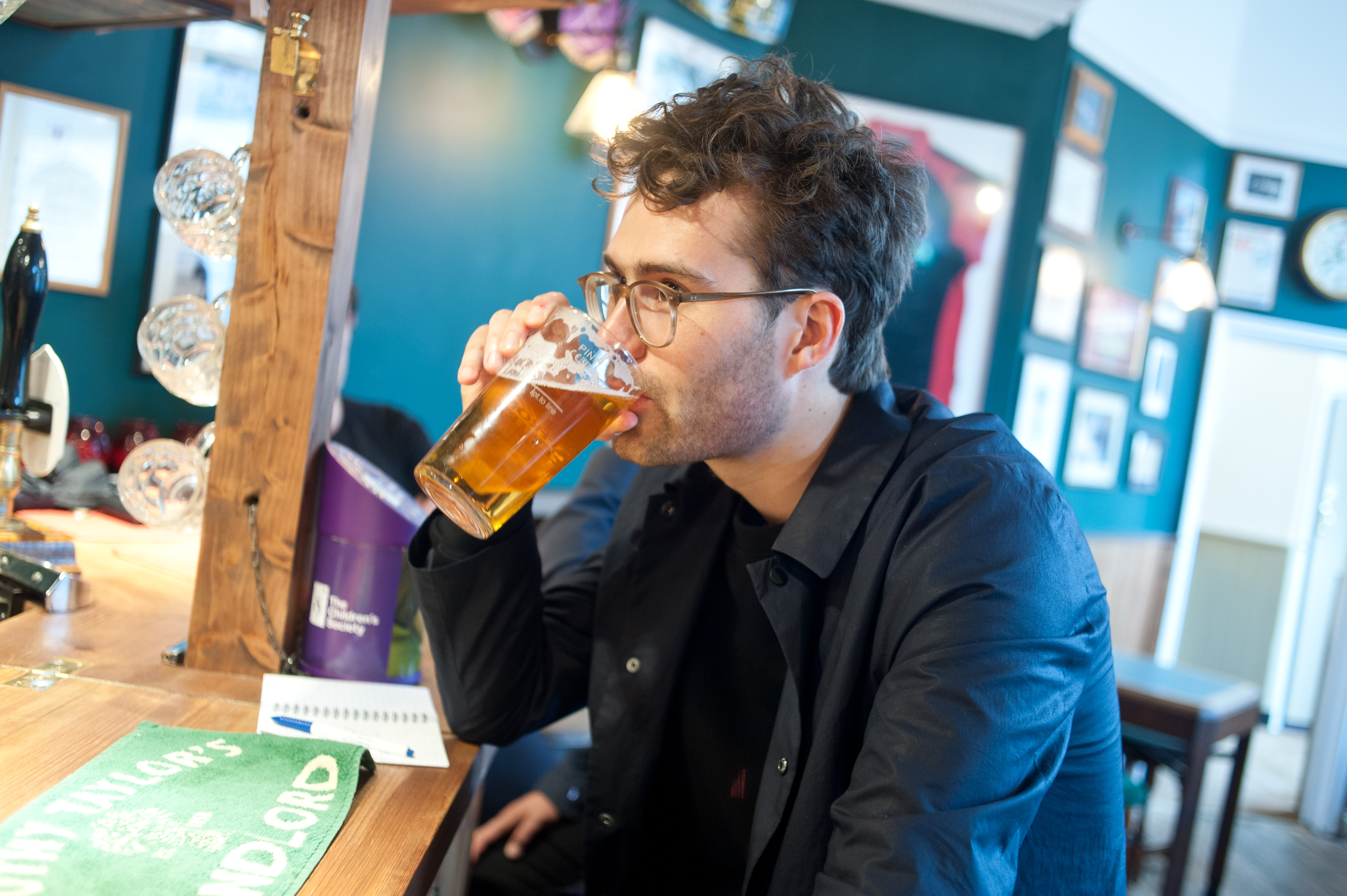 ?Si Barber/07739 472 922 Pub crawling at the St Radegund in Cambridge with Sebastian Kempkens. Image shows Sebastian drinking Habit ale.