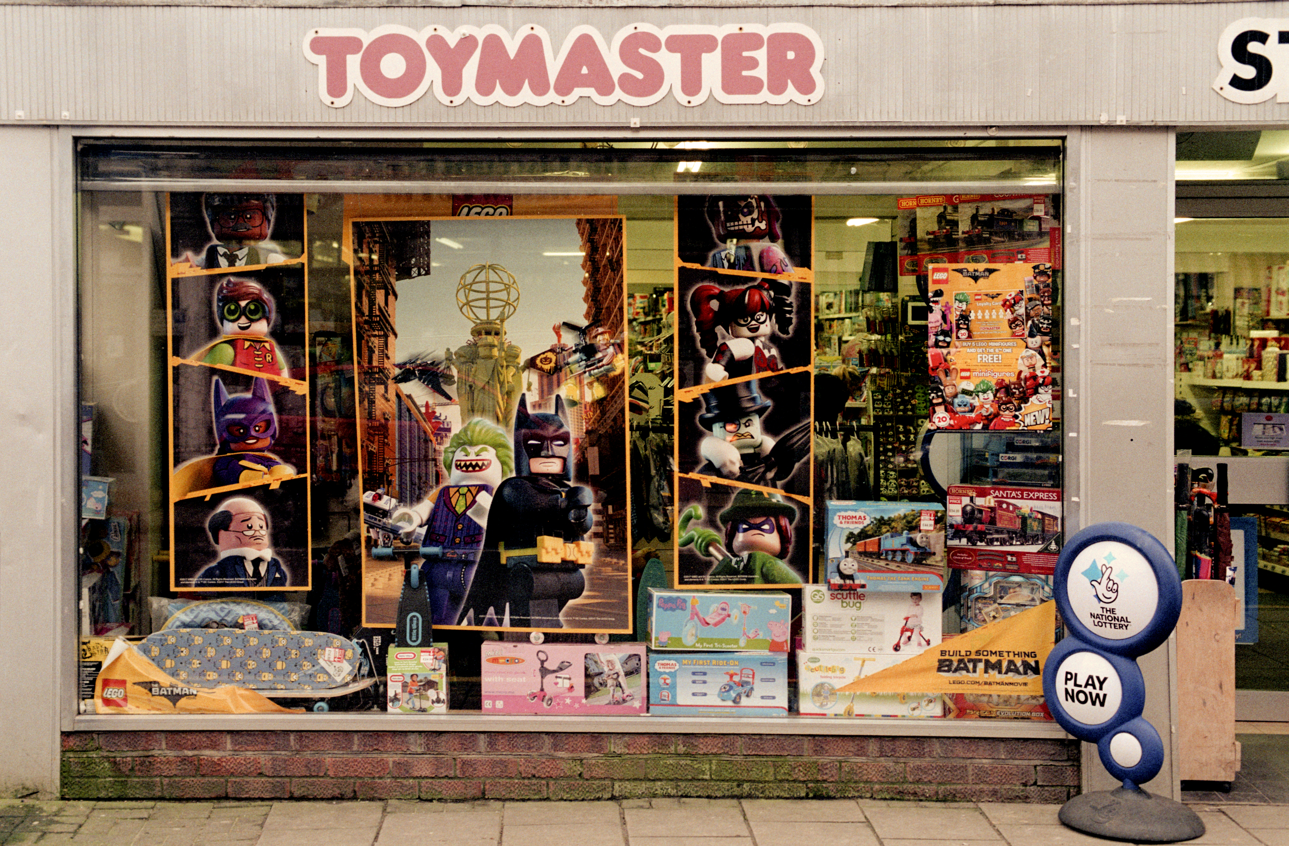 ?Si Barber Moral rights asserted. Toymaster toy shop with a lego batman display, Sheringham, Norfolk,UK.