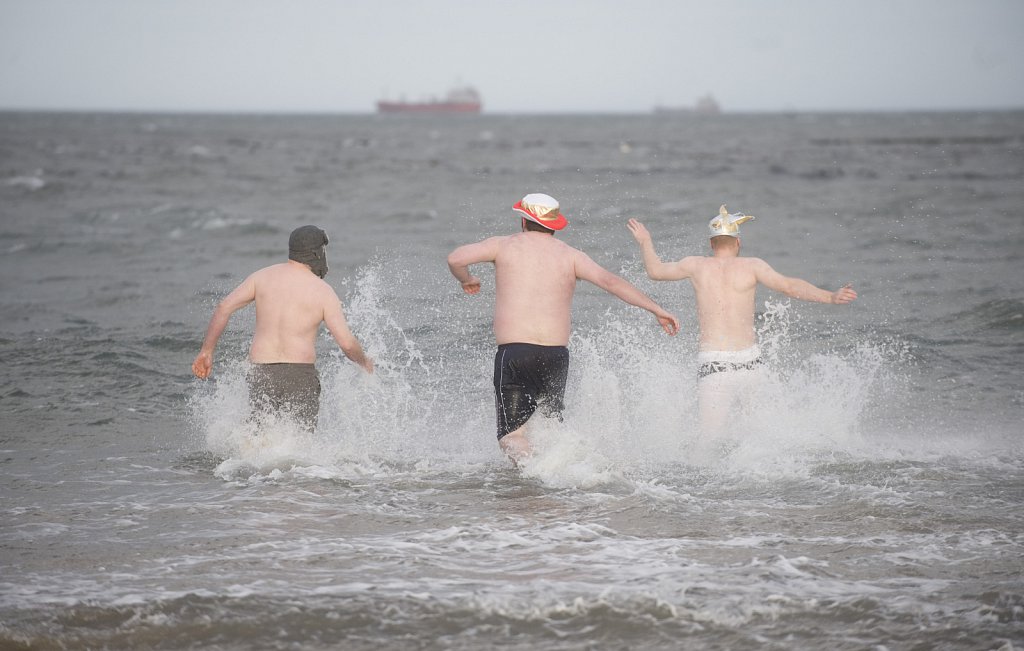 Three men going for a boxing day swim on Recar beach, North Yorkshire,UK.