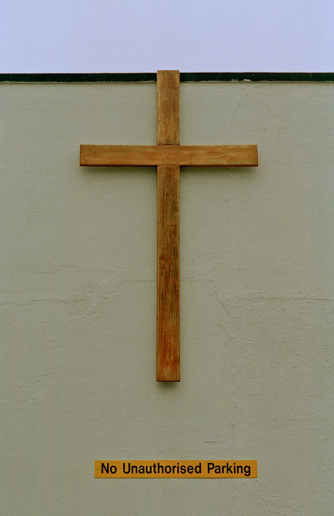 A crucifix and no parking sign outside the Oasis Centre Church, Swaffham, UK
