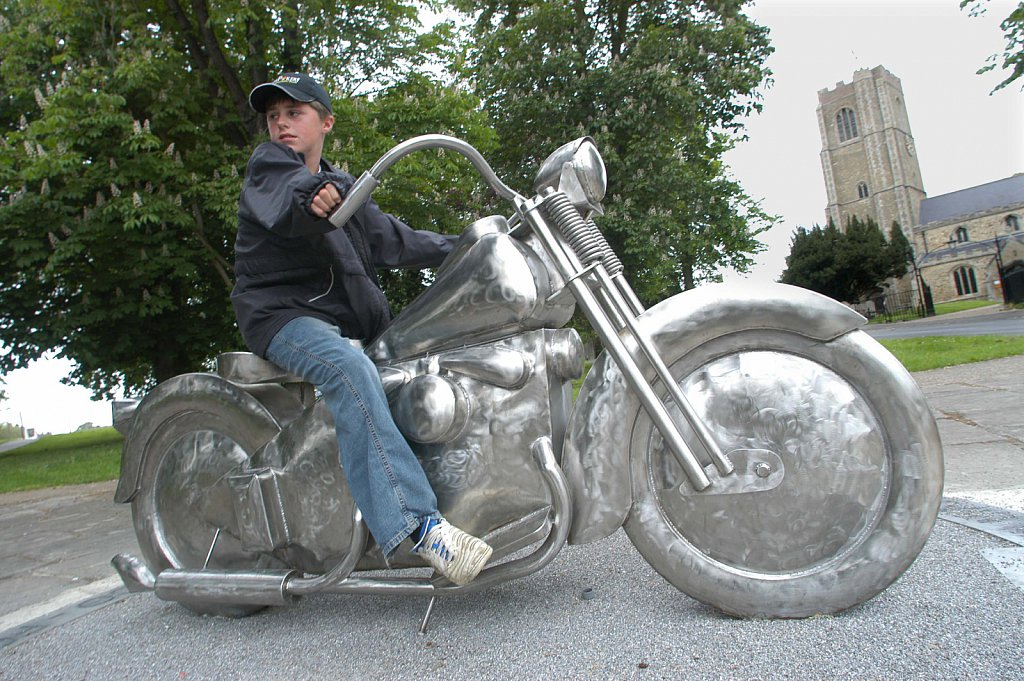 Pic by Si Barber - 07739 472 922 Chris Lee becomes one of the first to sit astride what may be the UK?s most unusual park bench. The ?20000 seat in the shape of a 1936 Knucklehead Harley Davidson in the village of Littleport , Cambridgeshire was commissioned to commemorate one of the village?s famous sons ? William Harley. From humble origins Harley emigrated from the Fenland village to America and fought in the Civil war. His son started the legendary motorcycle company with Scotsman Arthur Davidson in 1903. The aluminium statue is designed to be sat on by the public and celebrates 100 years of Harley in the USA. 24 05 05