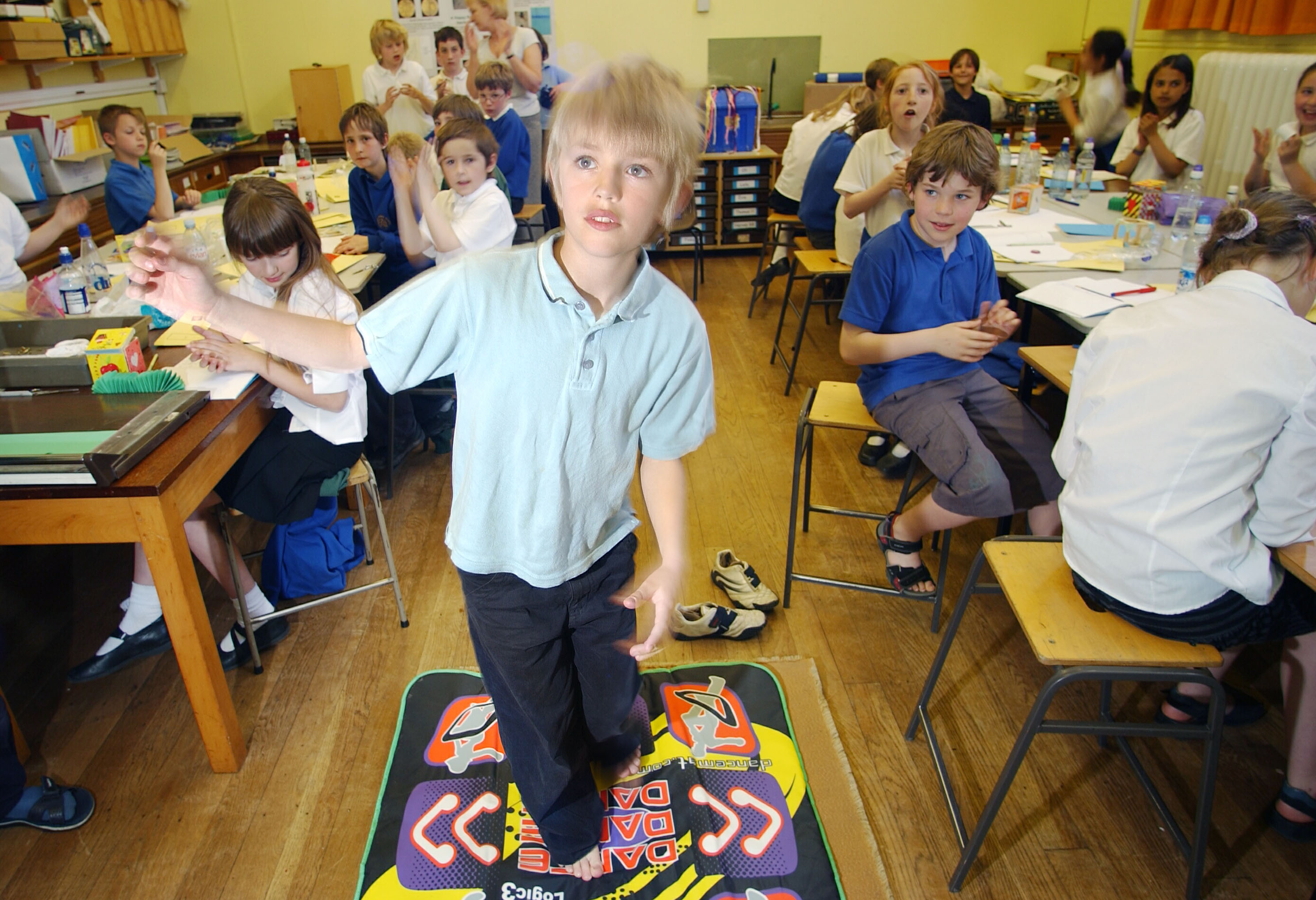 Mandatory Credit: ? Si Barber/07739 472 922 Year 5 children learning Spanish using an interactive dance mat