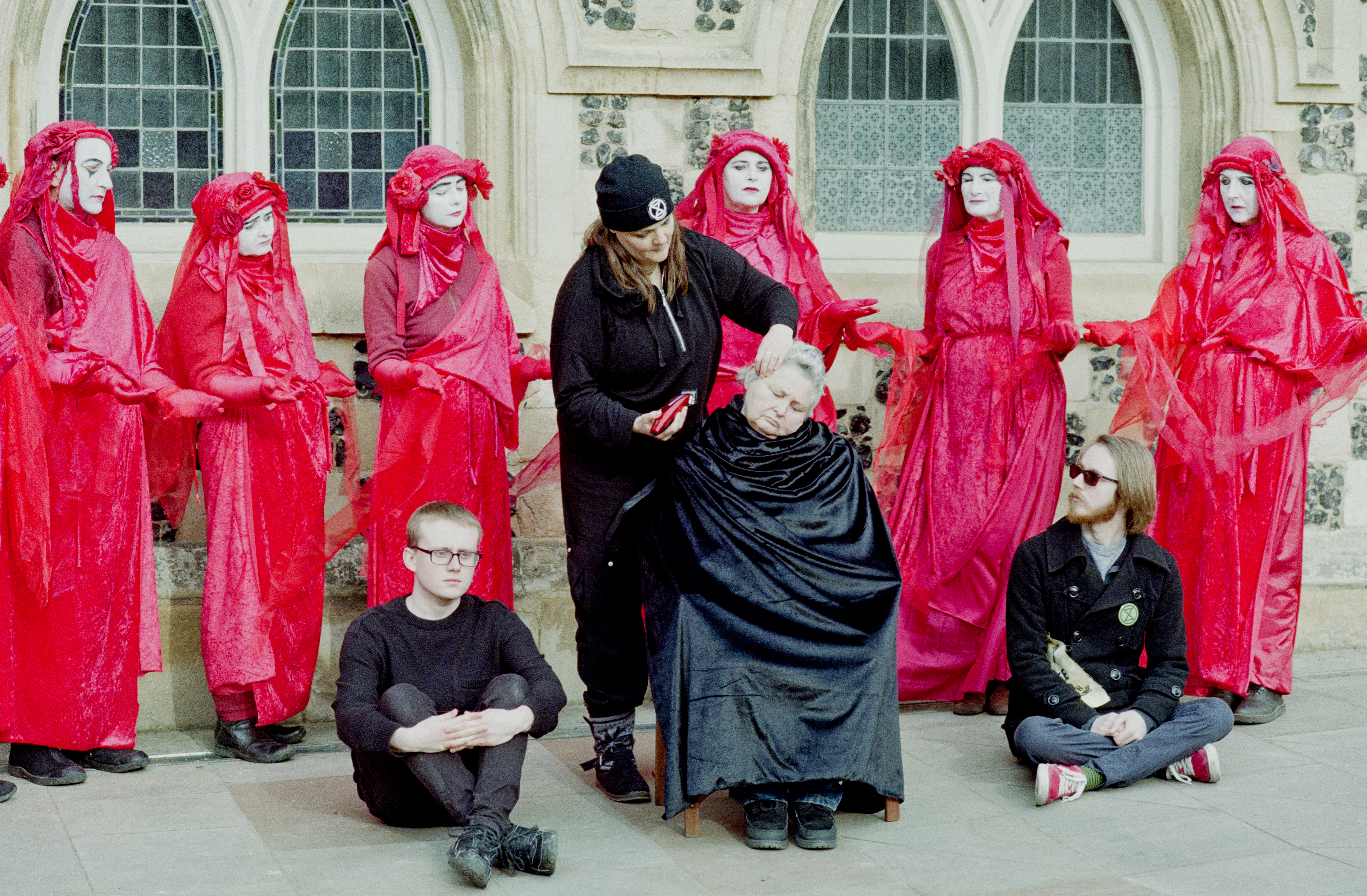 Extinction Rebellion protesting in King’s Lynn, Norfolk, UK, at the council’s refusal to declare a climate emergency on 8th February 2020. The group congregated outside the council offices and shaved each others heads as a symbol of mourning.