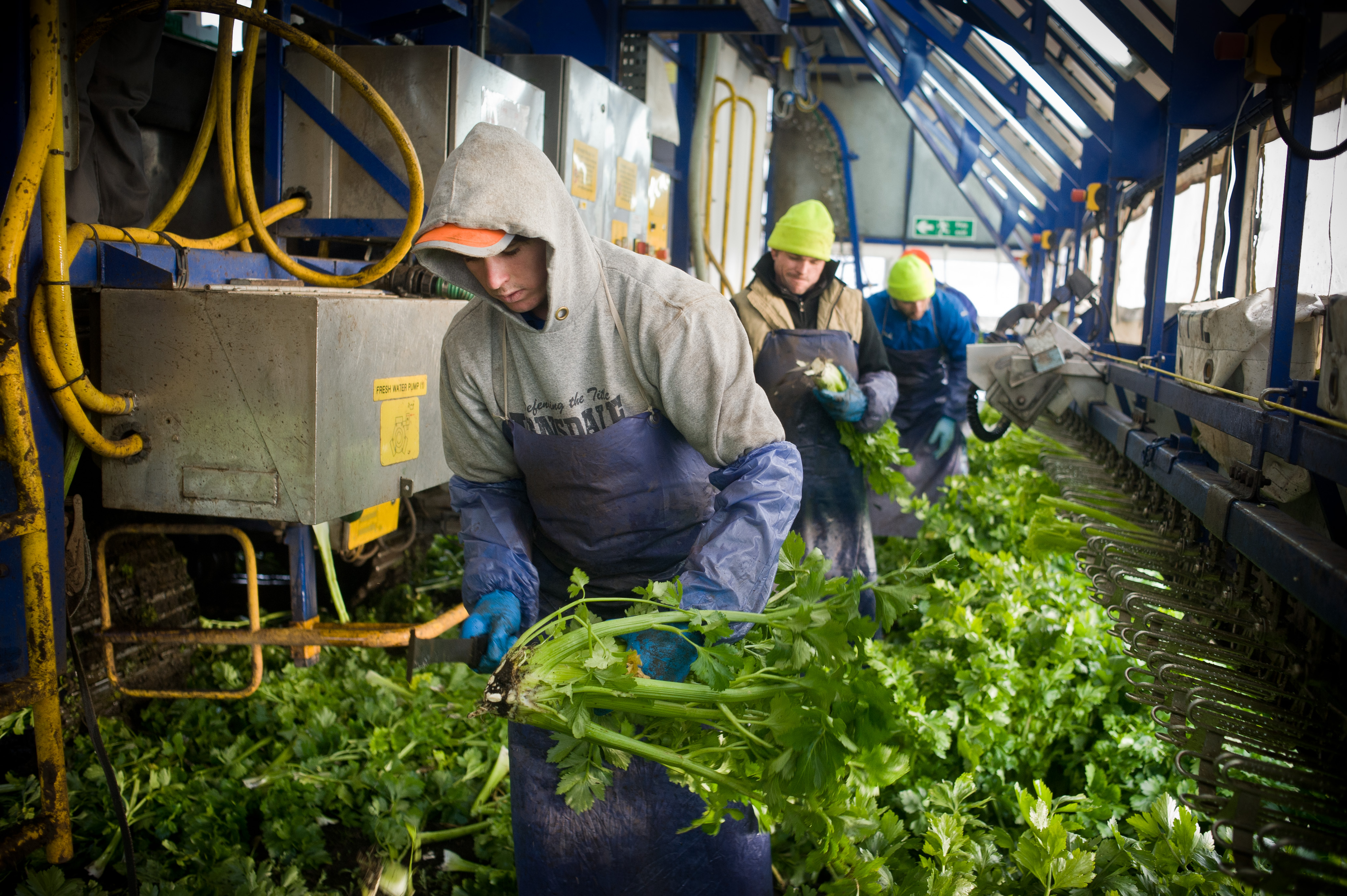 G's vegetable growers near Ely in Cambridgeshire. The company employs and provides accommodation and facilities for many workers from Eastern Europe. Picture shows - celerey being cut, processed and packed inside a rig in a field.