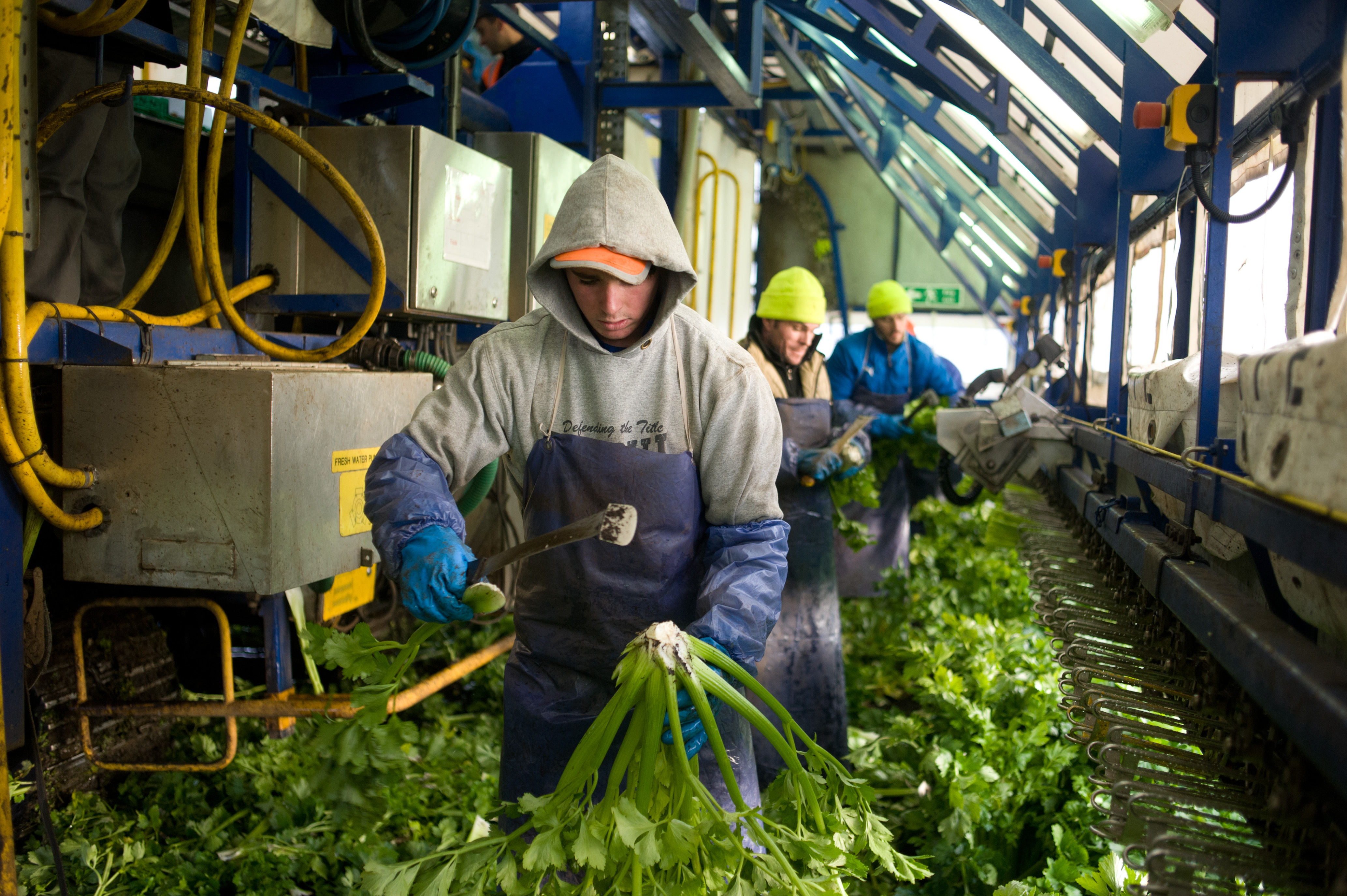 ©Si Barber. Moral rights asserted.   Vegetable growers near Ely in Cambridgeshire. The company employs and provides accommodation and facilities for many workers from Eastern Europe. Picture shows - celery being cut, processed and packed inside a rig in a field.