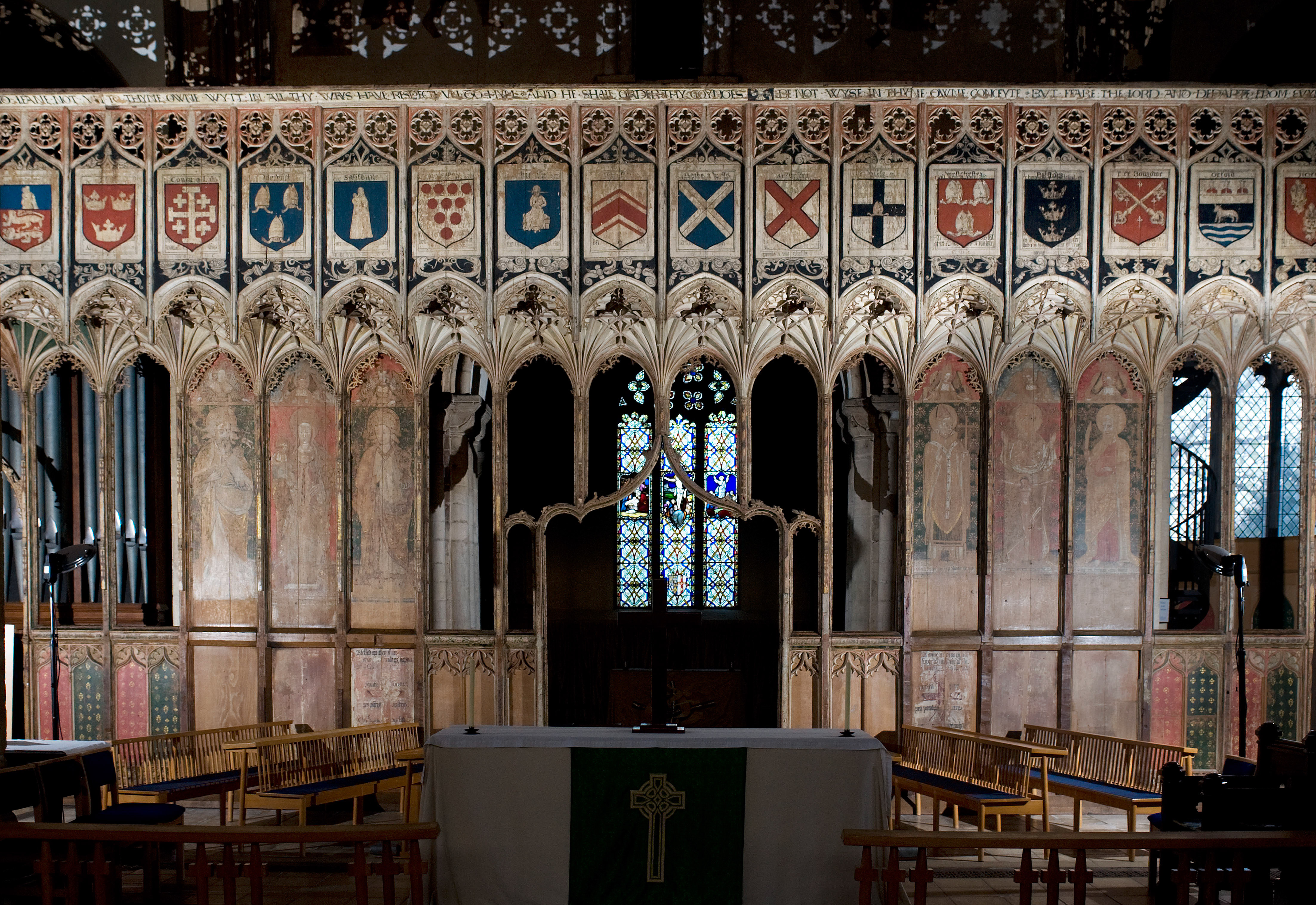 The rood screen and detail at St Mary's Church, Attleborough, Norfolk,UK. From the North (left) side, St John the Baptist , St John the Evangelist , the Blessed Virgin and Child. On the South side St Thomas of Canterbury, the Holy Trinity, and St Bartholomew. The church features a wall painting of the annunciation.