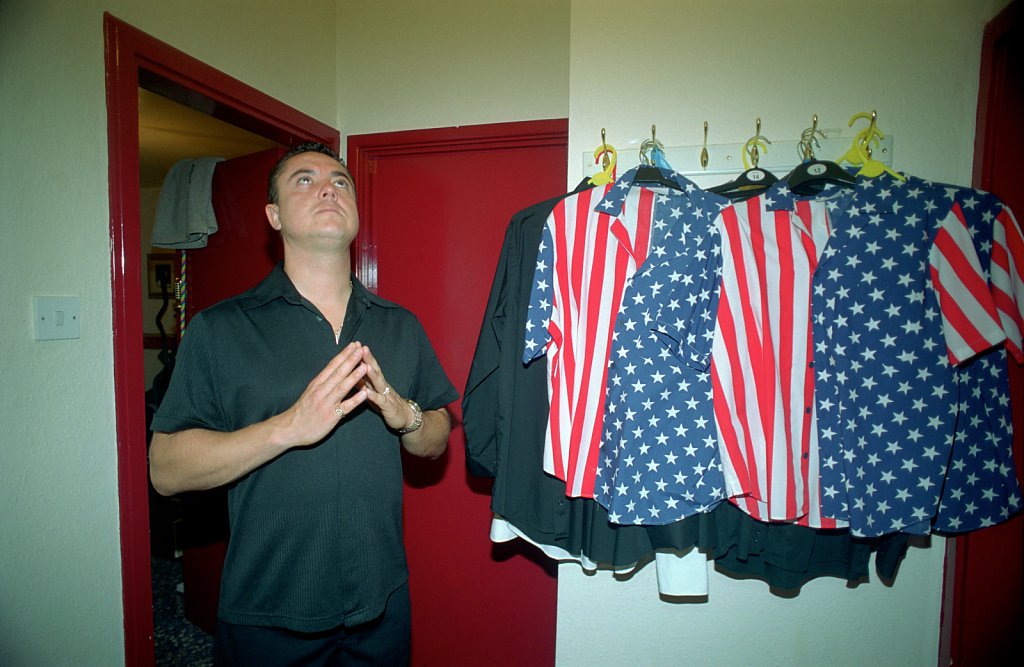 A Tom Jones tribute act praying before performing at Legends of Batley in West Yorkshire, UK