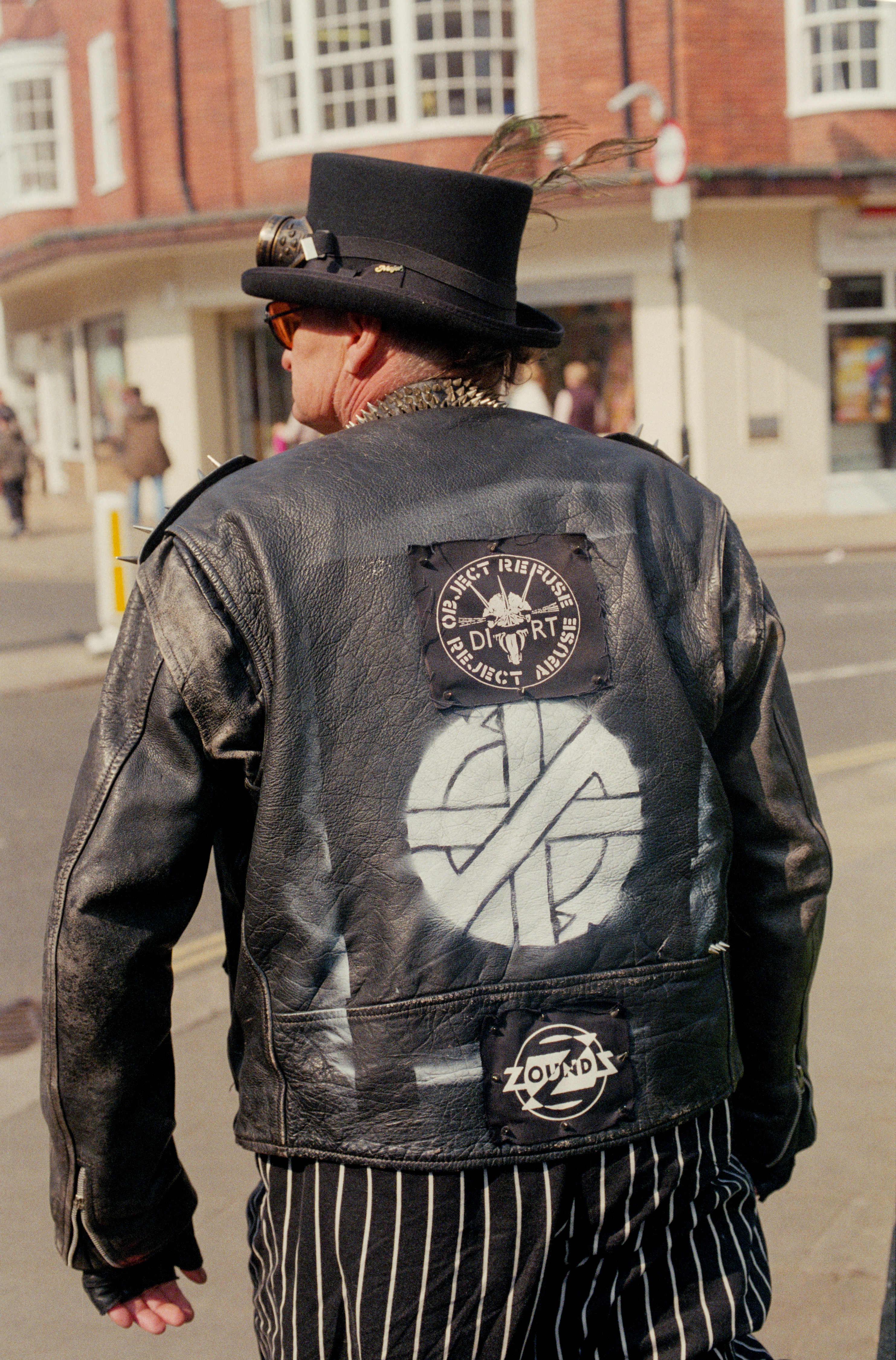 A biker wearing a patching declaiming his christianity, Wells Next The Sea, Norfolk.