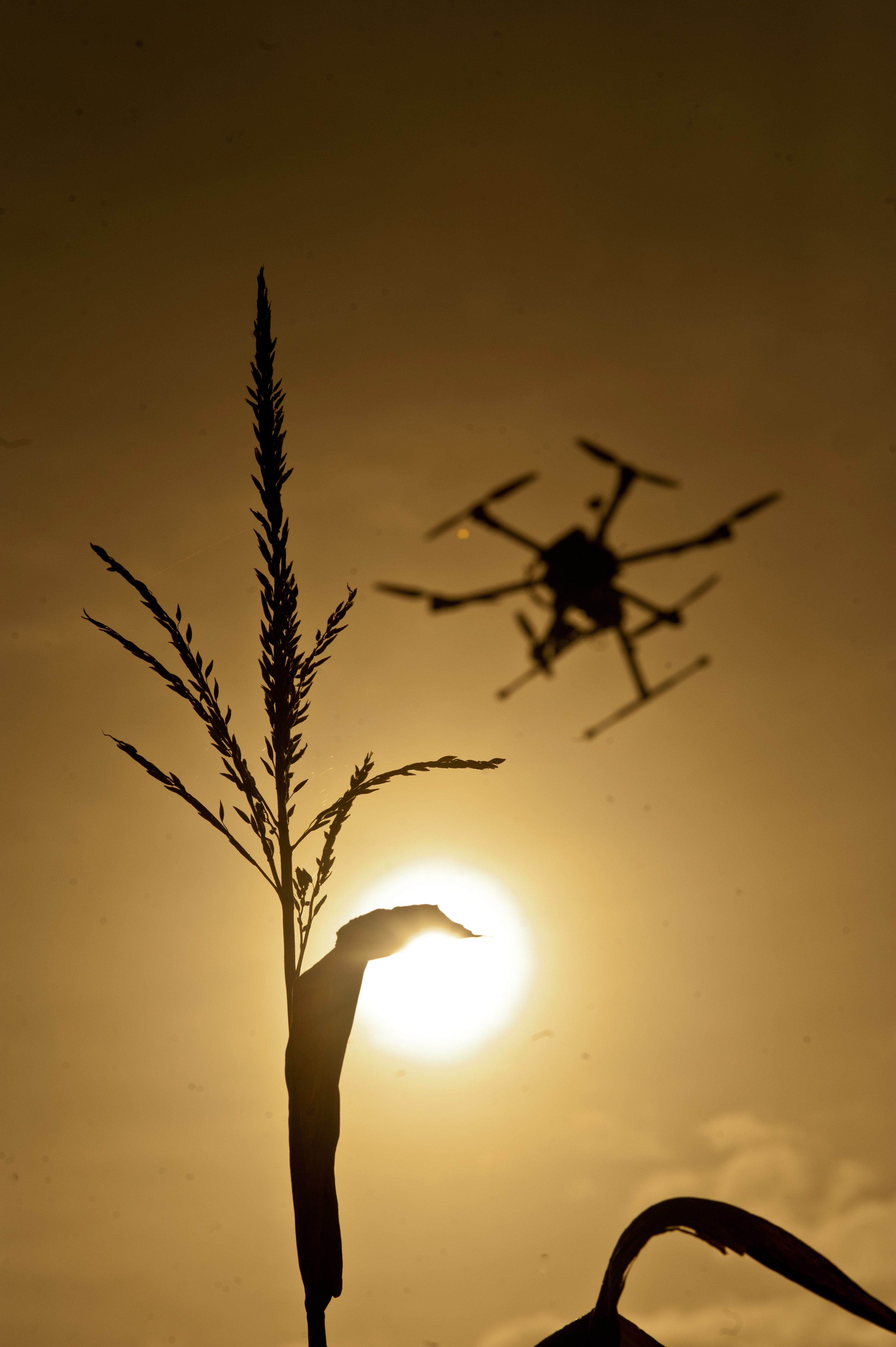 A pilot flying an agricultural drone over a crop of sweetcorn