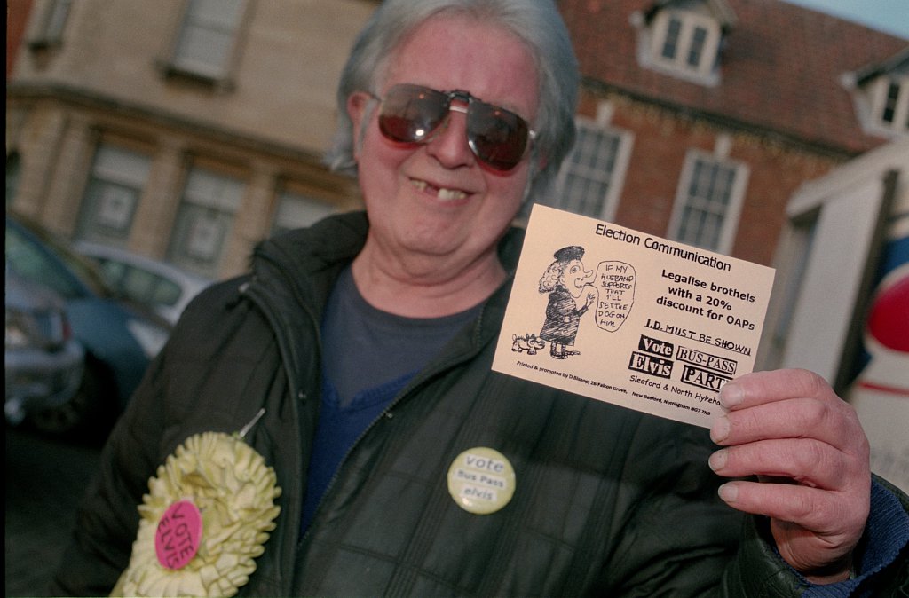 David Bishop, aka Lord Byro of the Church of the Militant Elvis Party campaigning at the Sleaford & North Hykeham by-election, Lincolnshire. He polled 55 votes, losing to Caroline Johnson of the Conservative Party.