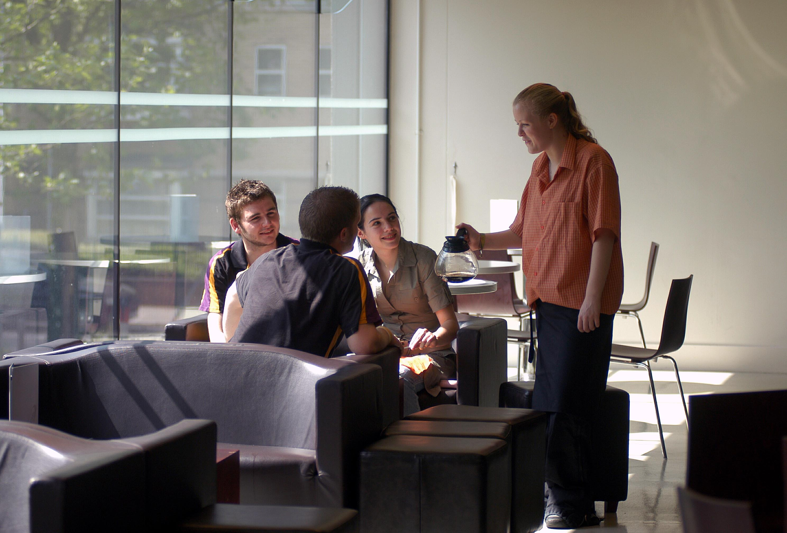 Pic by Si Barber - 07739 472 922 Students (L-R) Ciaran Pietzka, Andi Thwaites and Kim Tebbutt are served coffee by waitress Erin in the refectory area of the Anglia Polytechnic University, Cambridge. 270505. Ordered by Ranjit