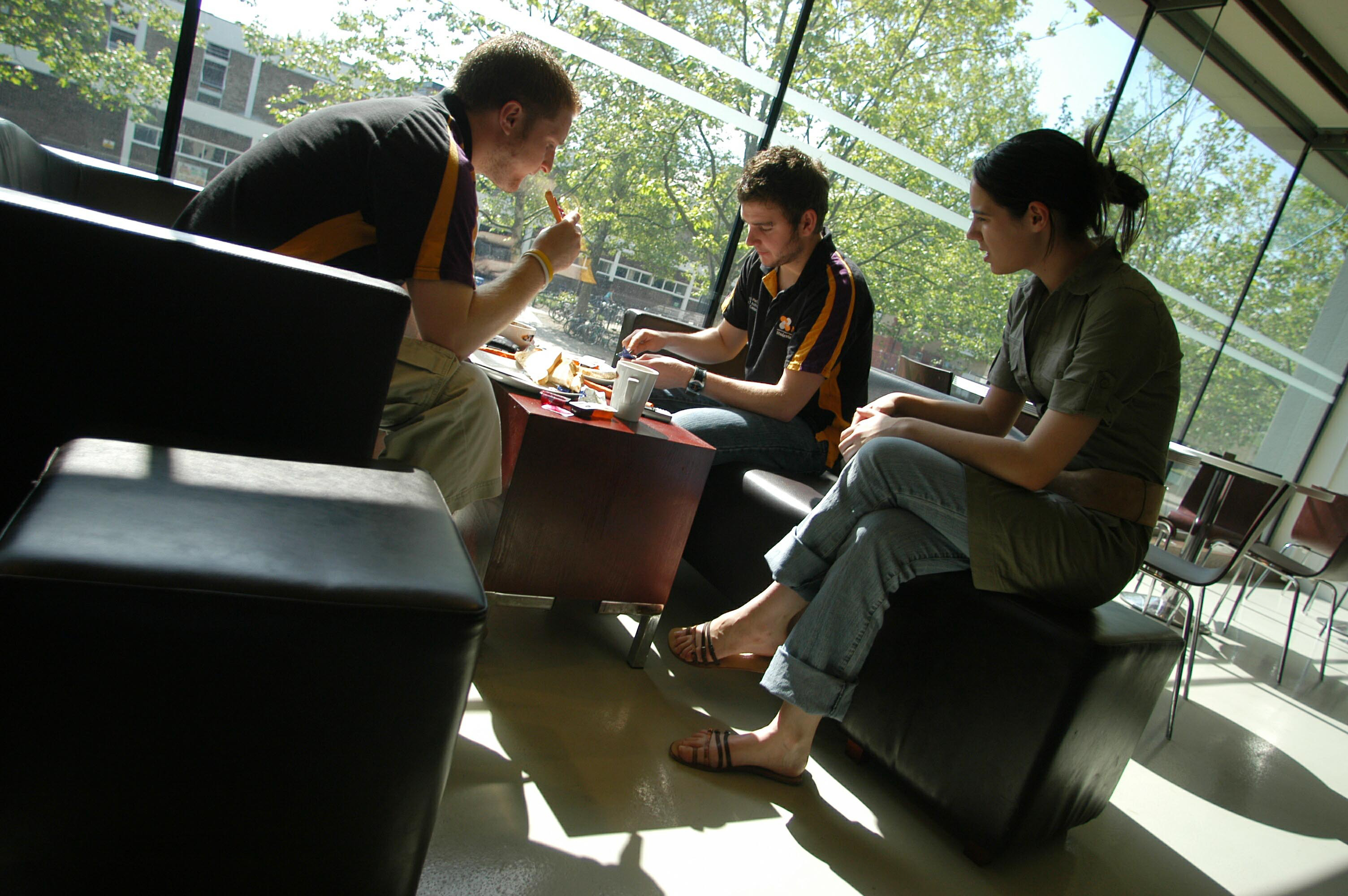 Pic by Si Barber - 07739 472 922 Students (L-R) Andi Thwaites, Ciaran Pietzka, and Kim Tebbutt in the refectory area of the Anglia Polytechnic University, Cambridge. 270505. Ordered by Ranjit