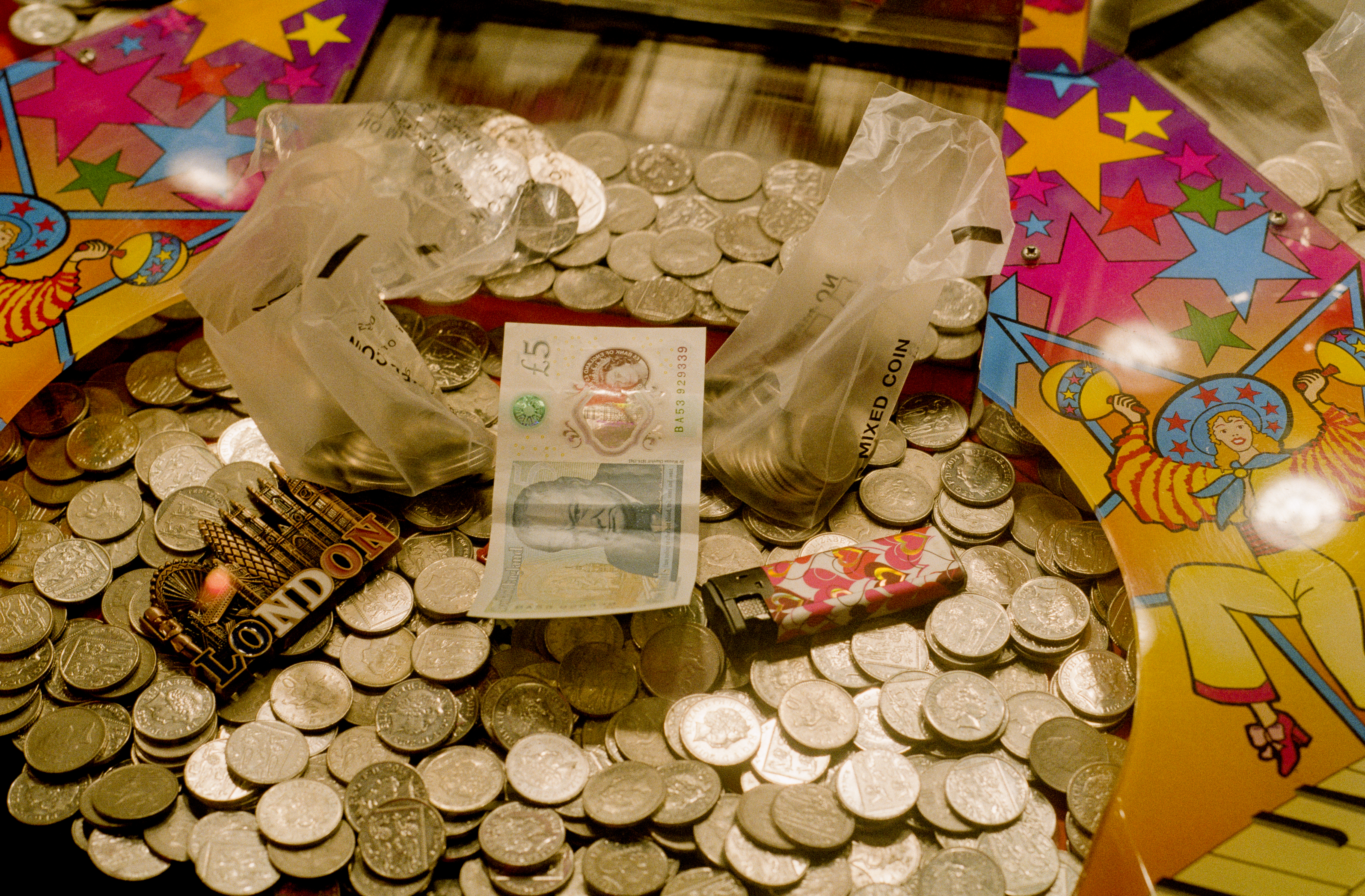 A man hauls a crucifix past the Leiesureland amusement arcade in Great Yarmouth. Norfolk,UK.
