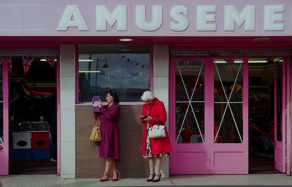 Two women looking at their mobile phones outside an amusement arcade, Sheringham, Norfolk.