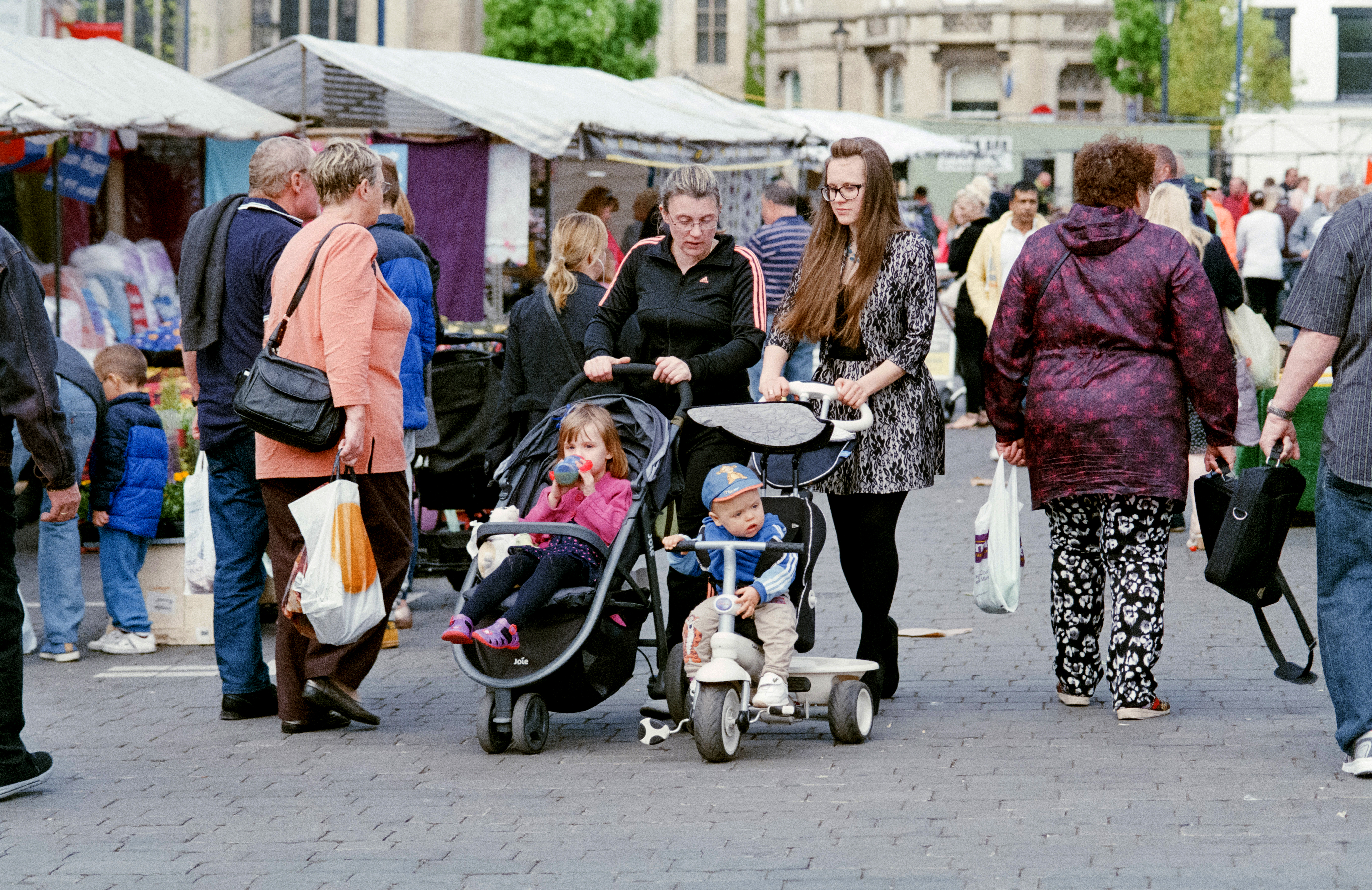 ? Si Barber 07739 472 922 Two young women pushing prams through Boston marketplace,UK