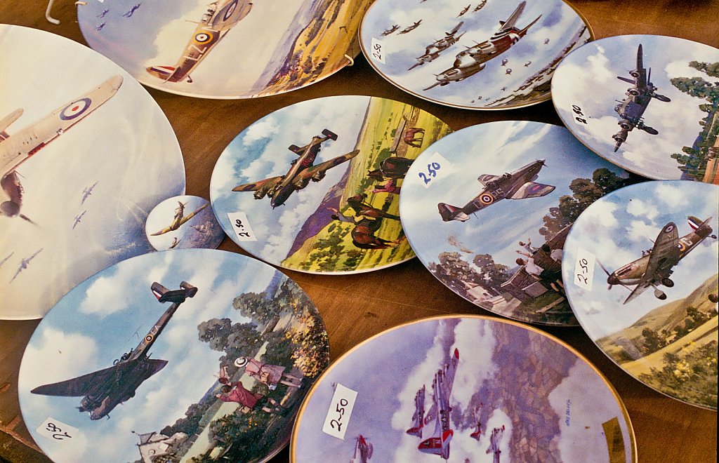 WW2 Spitfire plates on sale at Swaffham Market, Norfolk