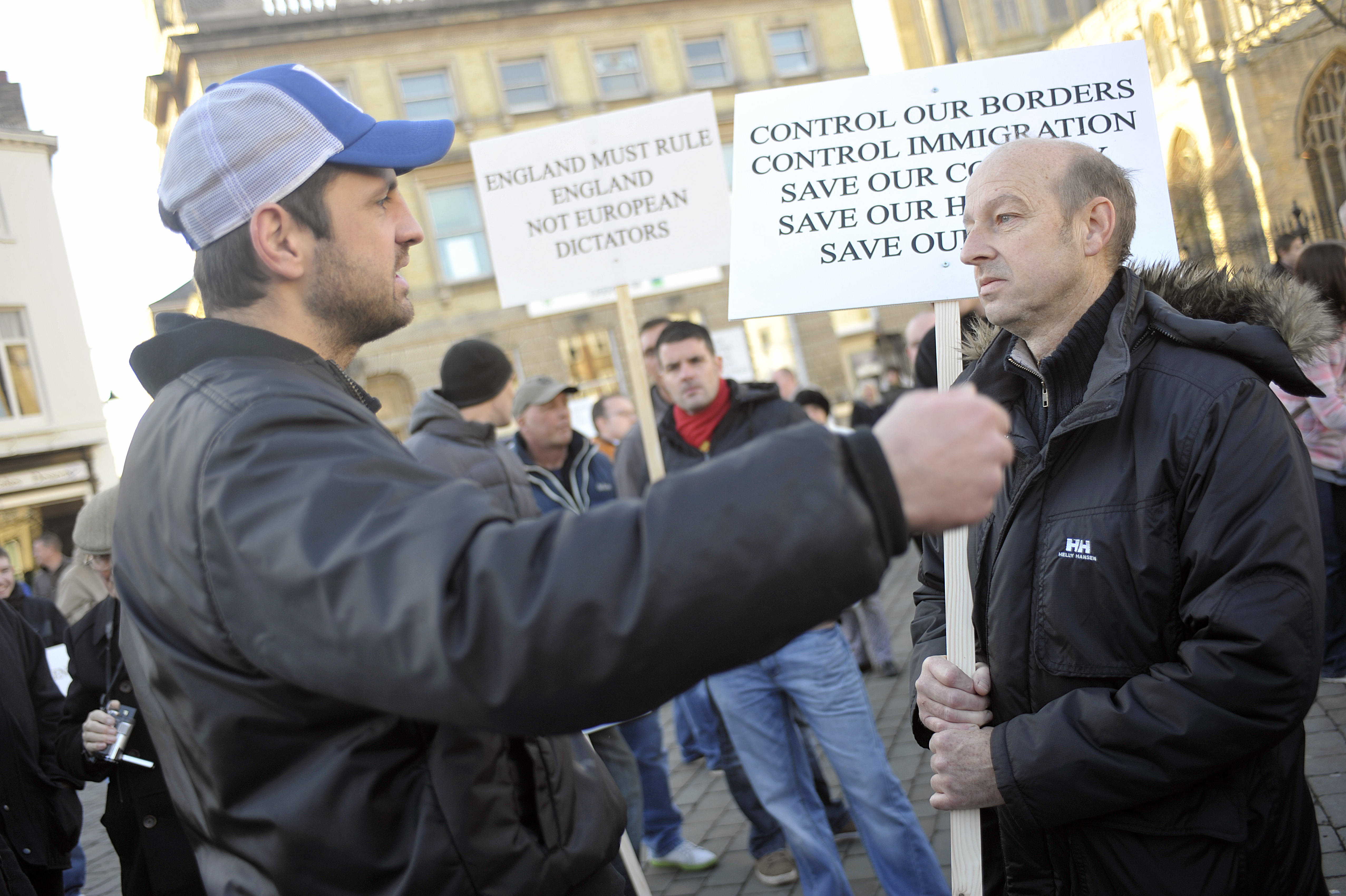 ©Si Barber/07739 472 922. Protestors in Boston, Lincolnshire,UK demonstrating against the number of migrants who have come to the town. Boston, like many town in Eastern England saw a rise in migration from Eastern Europe in the early years of the century.