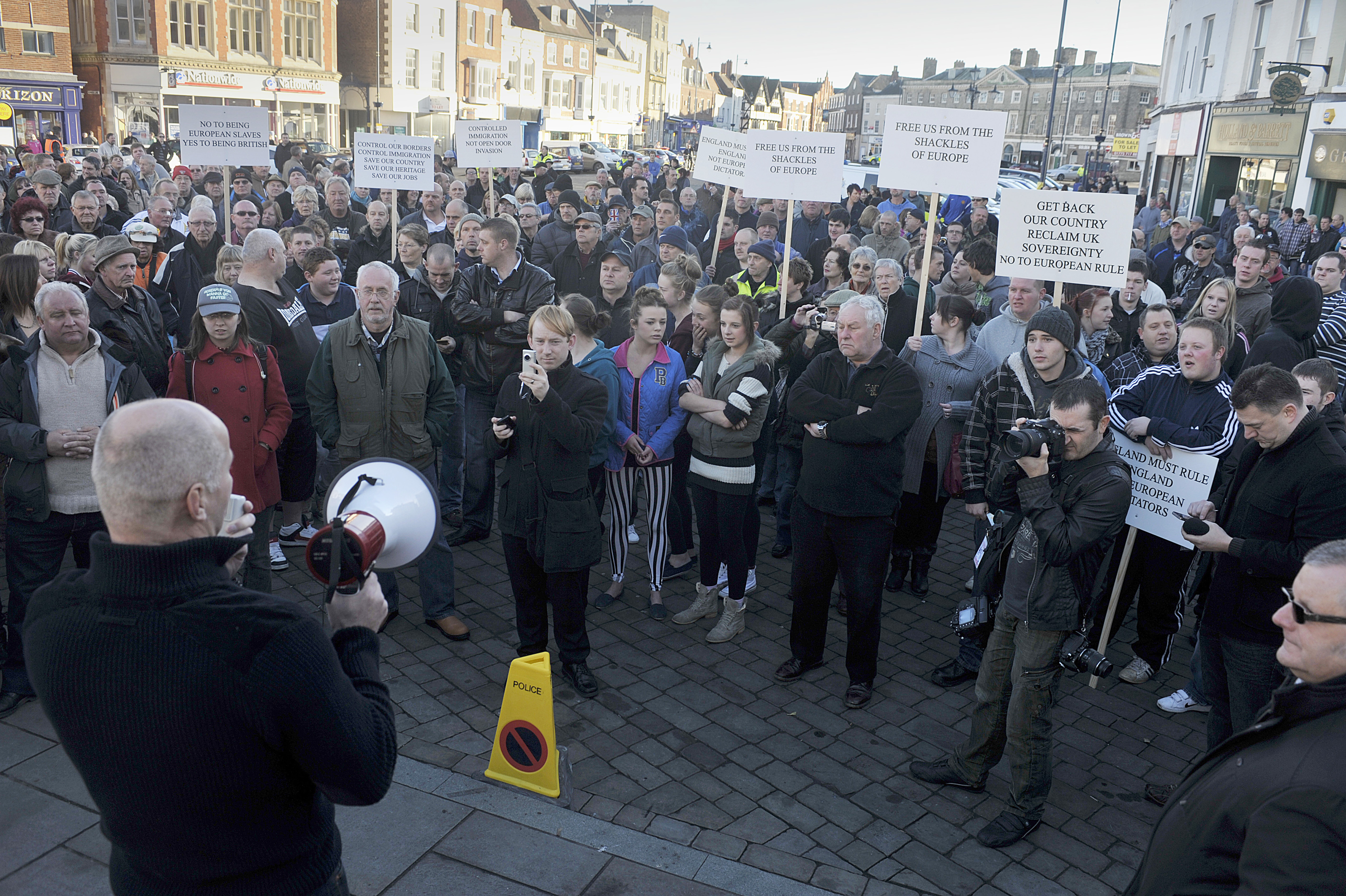 ©Si Barber/07739 472 922. Protestors in Boston, Lincolnshire,UK demonstrating against the number of migrants who have come to the town. Boston, like many town in Eastern England saw a rise in migration from Eastern Europe in the early years of the century.