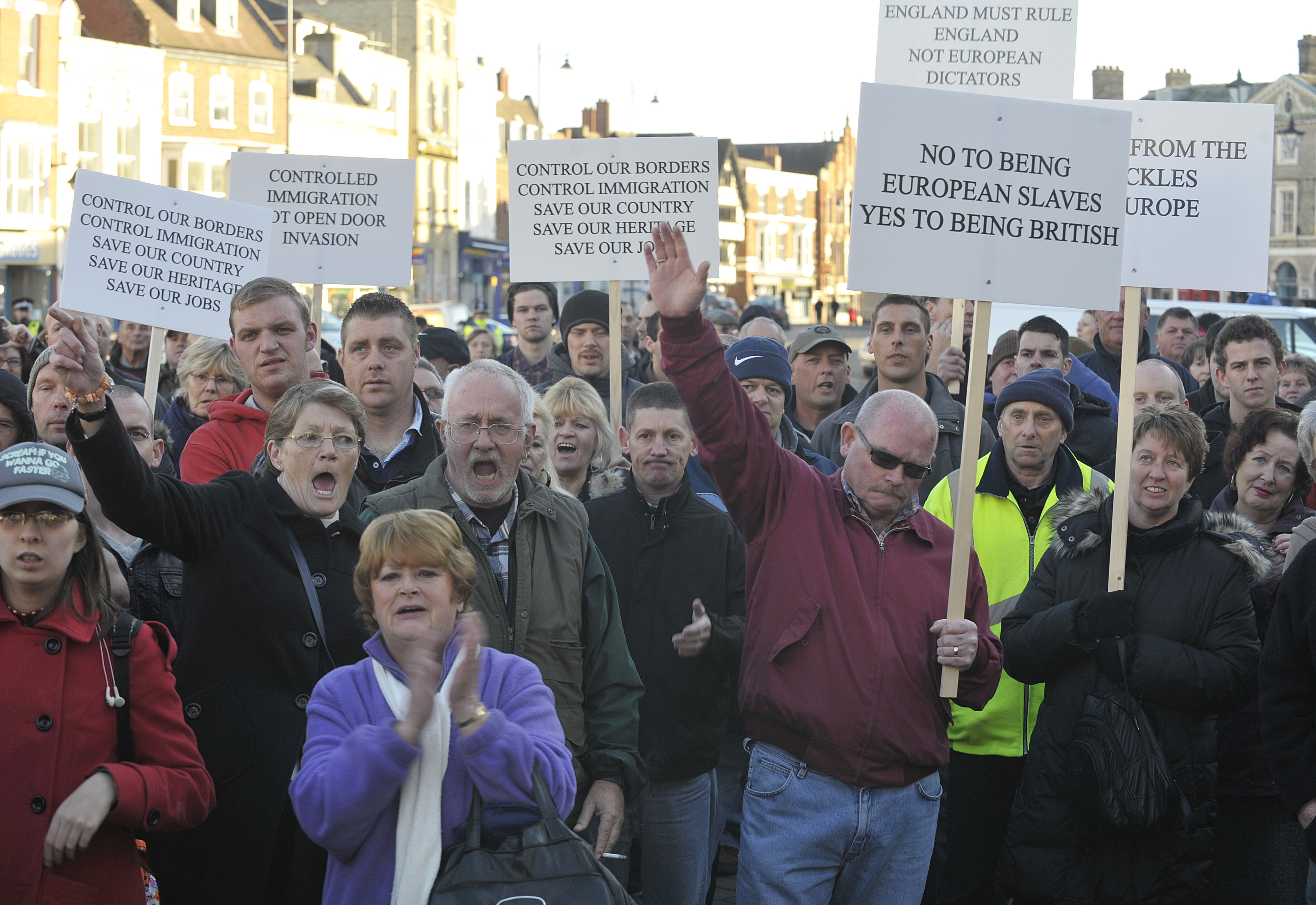 ©Si Barber/07739 472 922. Protestors in Boston, Lincolnshire,UK demonstrating against the number of migrants who have come to the town. Boston, like many town in Eastern England saw a rise in migration from Eastern Europe in the early years of the century.