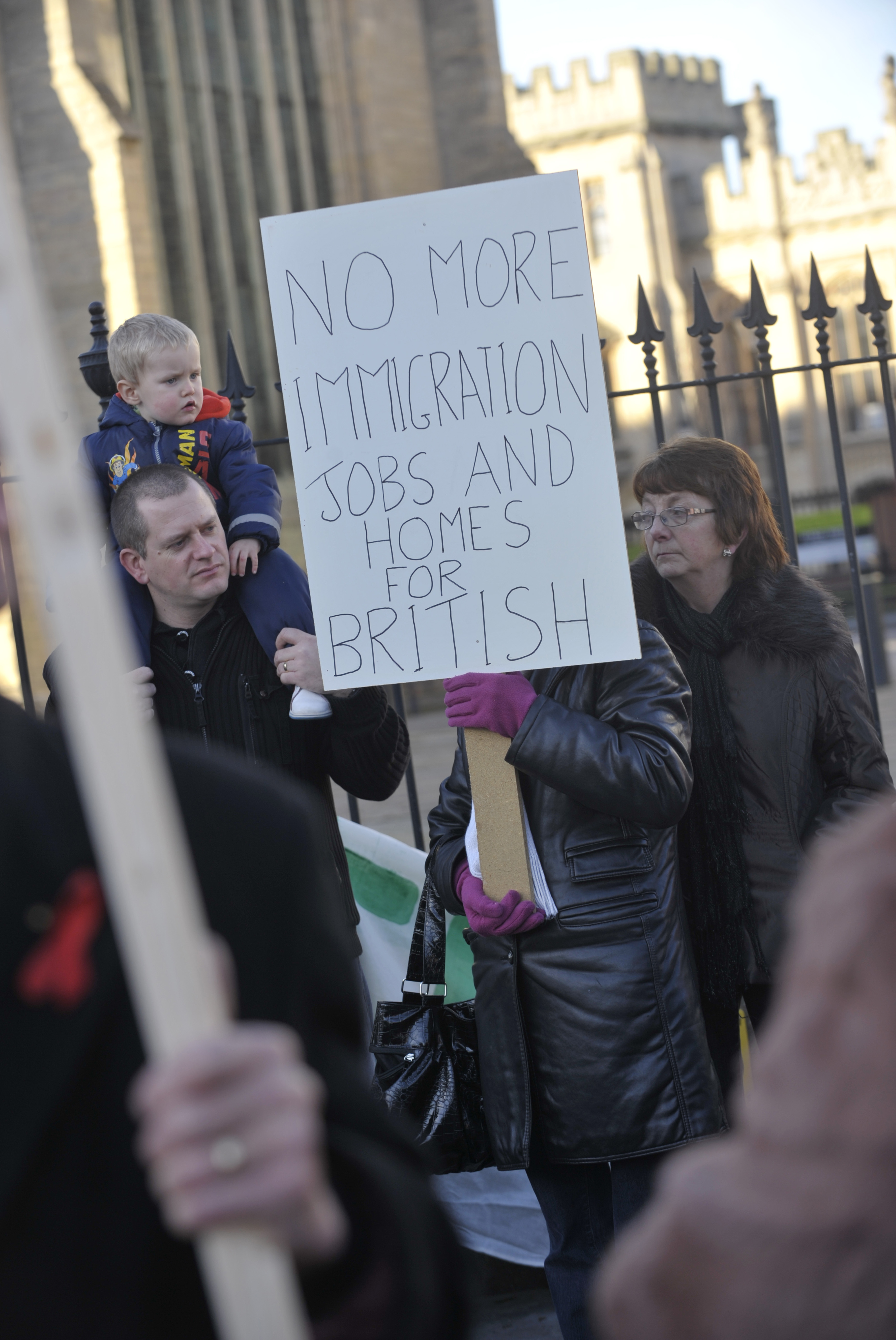 ©Si Barber/07739 472 922. Protestors in Boston, Lincolnshire,UK demonstrating against the number of migrants who have come to the town. Boston, like many town in Eastern England saw a rise in migration from Eastern Europe in the early years of the century.