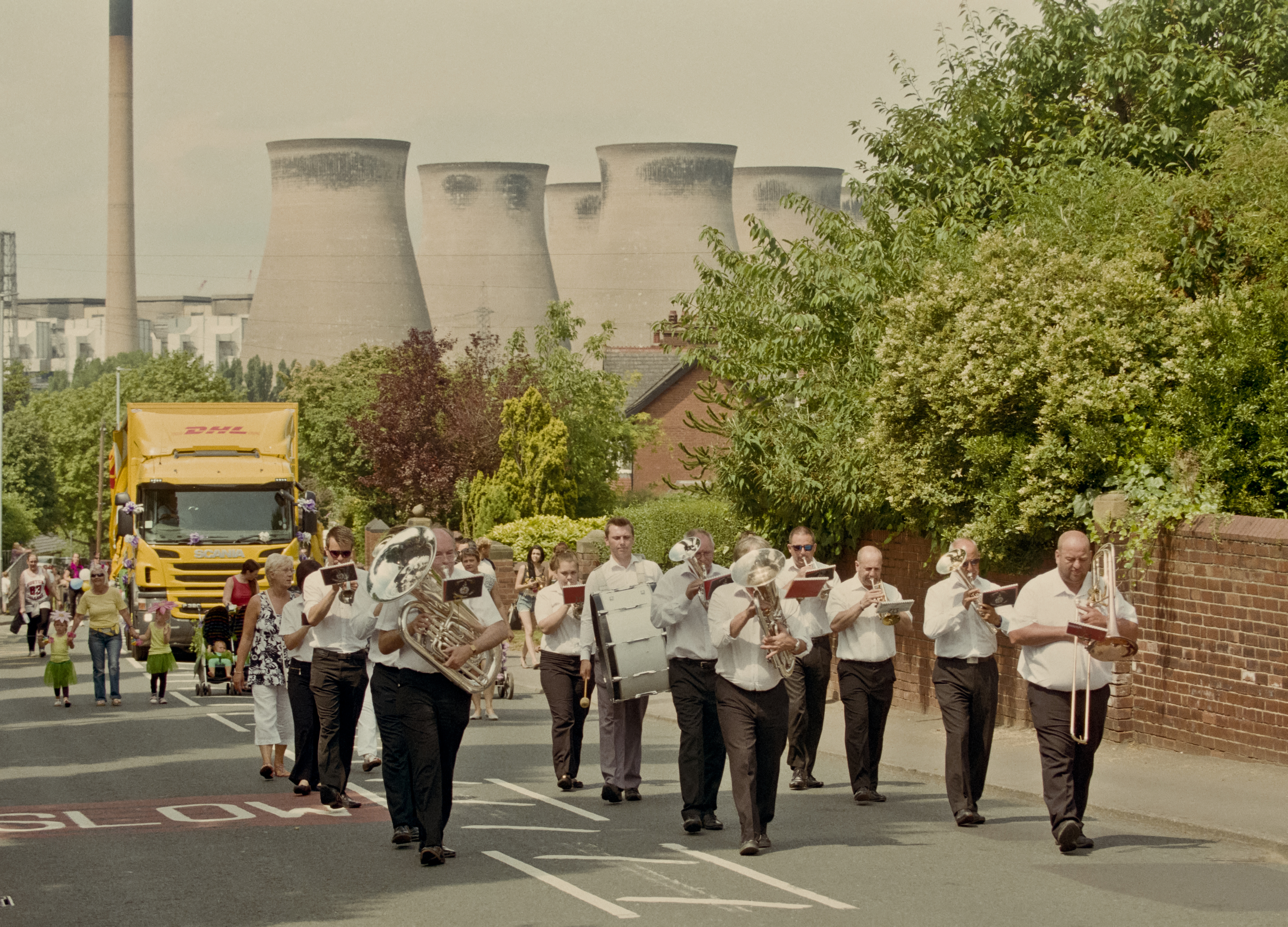Knottingley Silver Band make their way up Hill Top Road in 2014 with Ferrybridge Power Station looming in the backgorund.