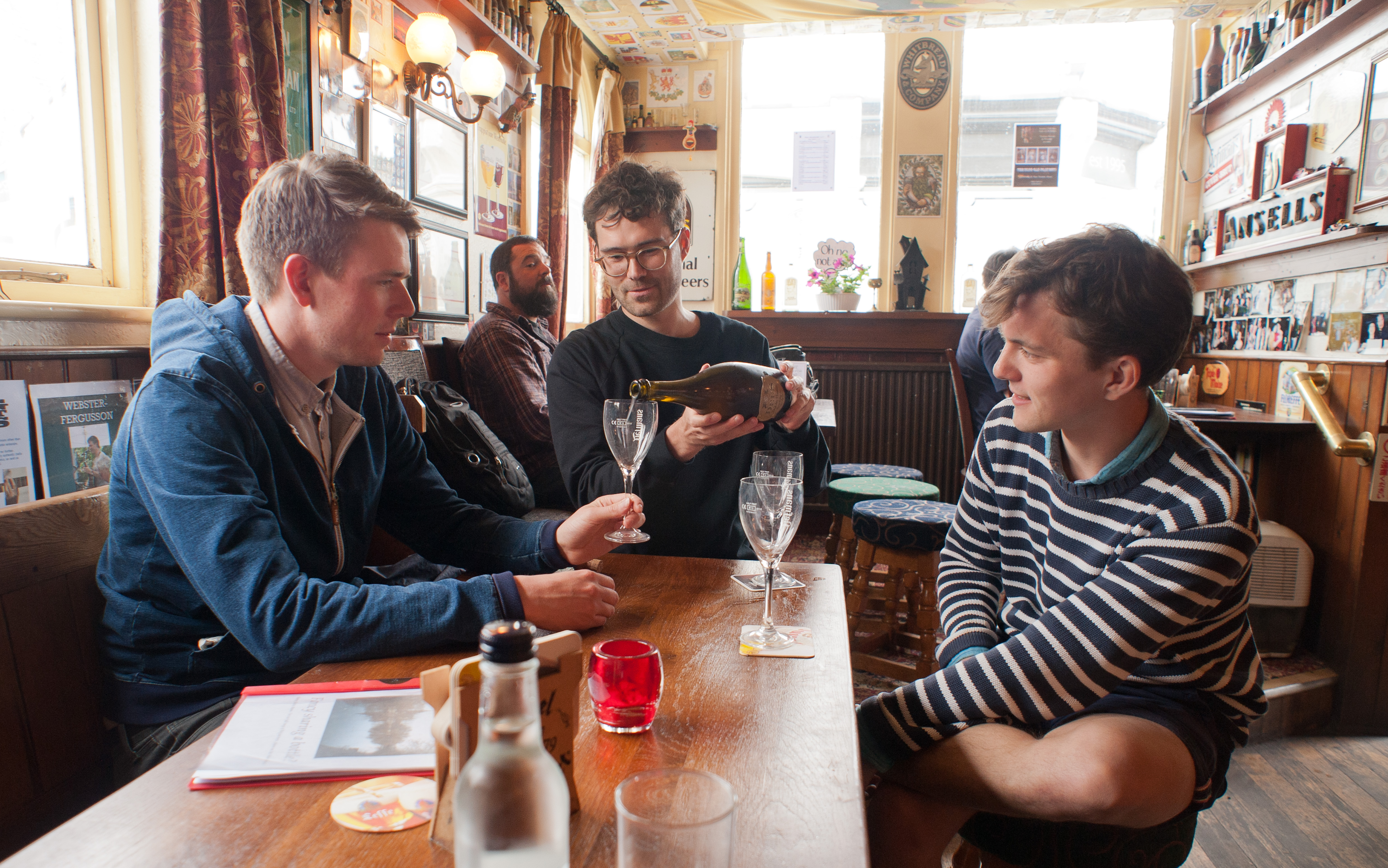 ?Si Barber/07739 472 922 Pub crawling in Cambridge with Sebastian Kempkens. Image shows Sebastian (black top) Kieran (dark blue) and Freddie (stripy top) trying Deus, an 11% Belgian beer
