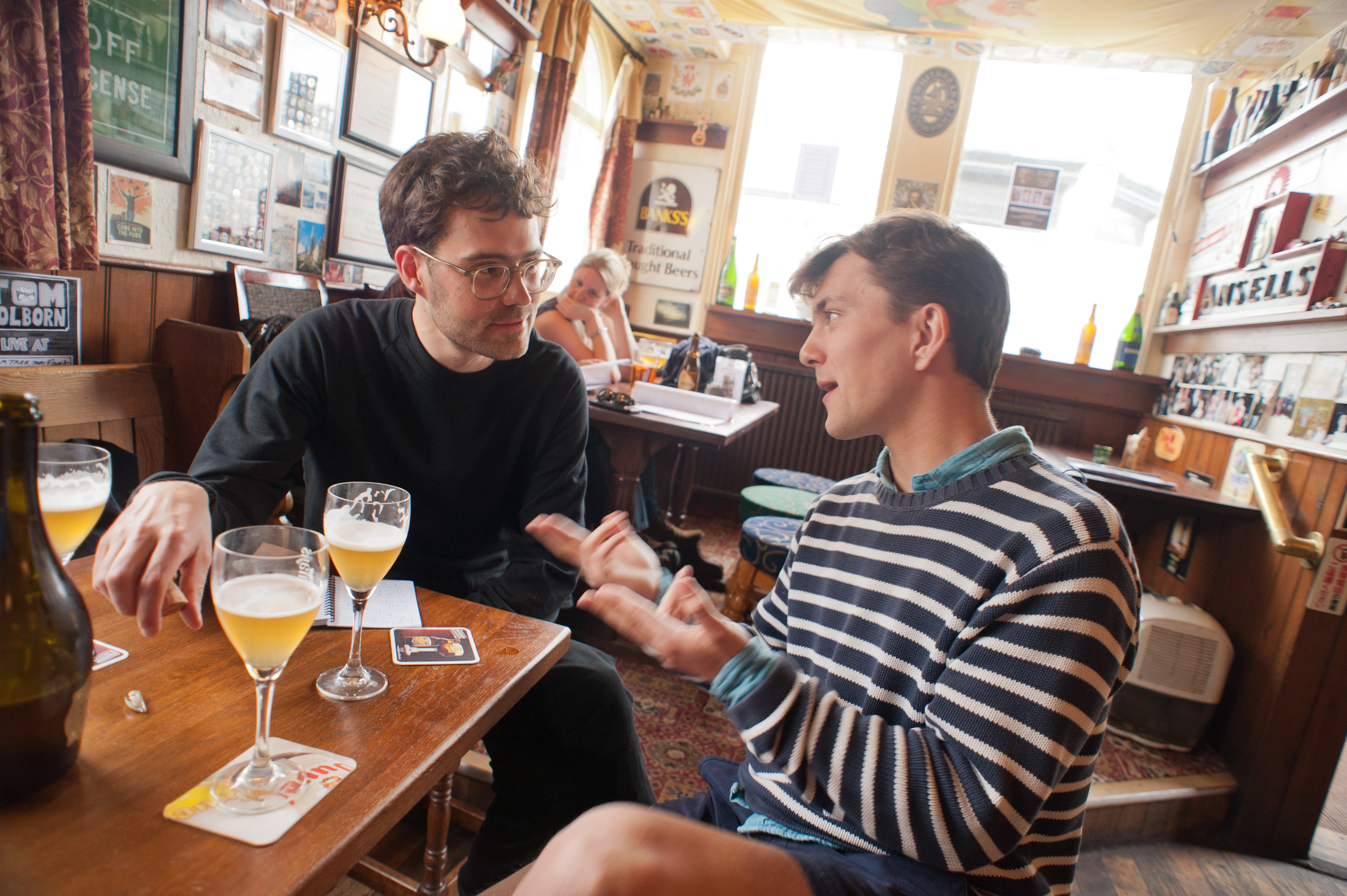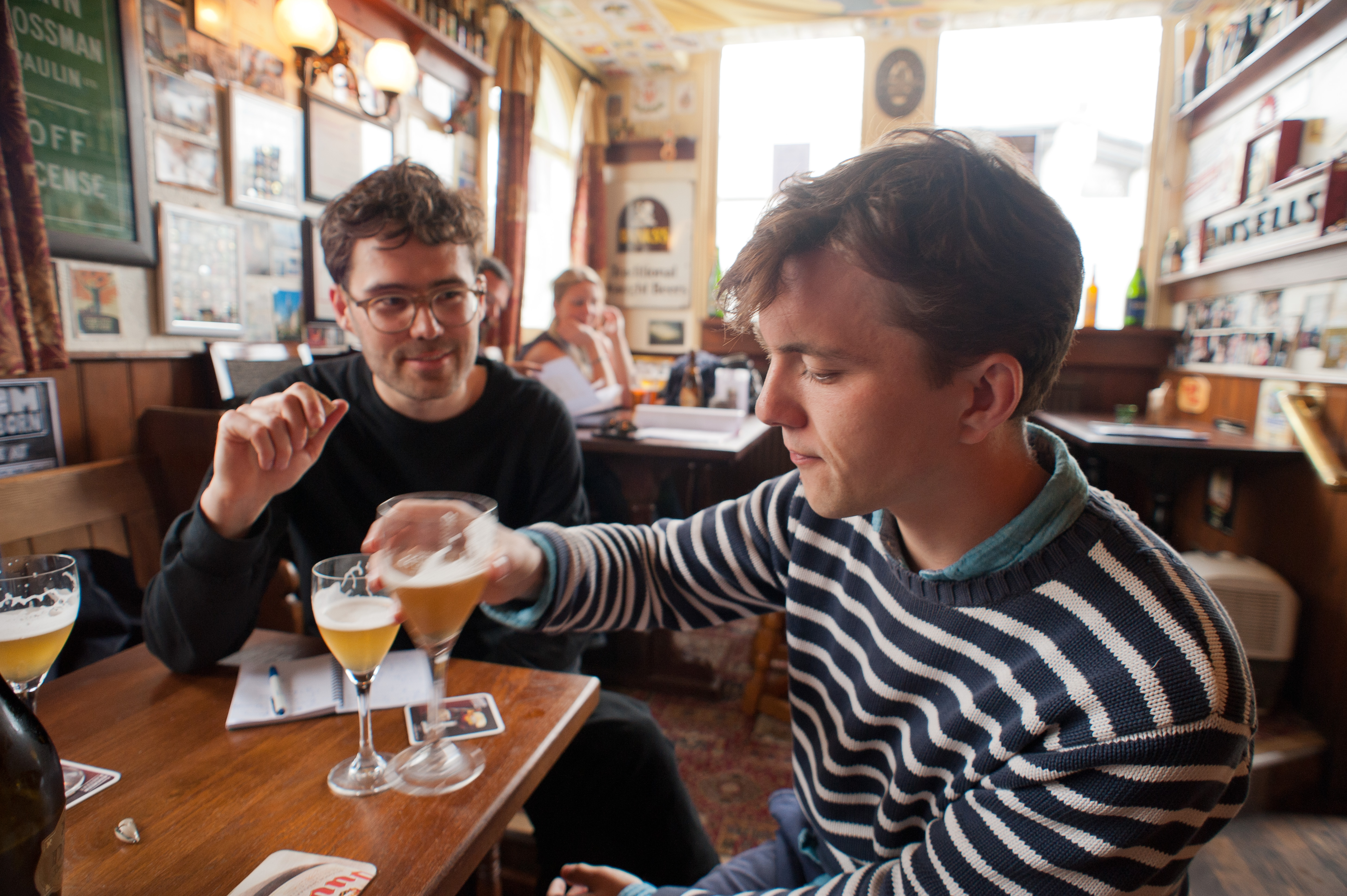 ?Si Barber/07739 472 922 Pub crawling in Cambridge with Sebastian Kempkens. Image shows Kieran (dark blue) trying Deus, an 11% Belgian beer with local David Jones.