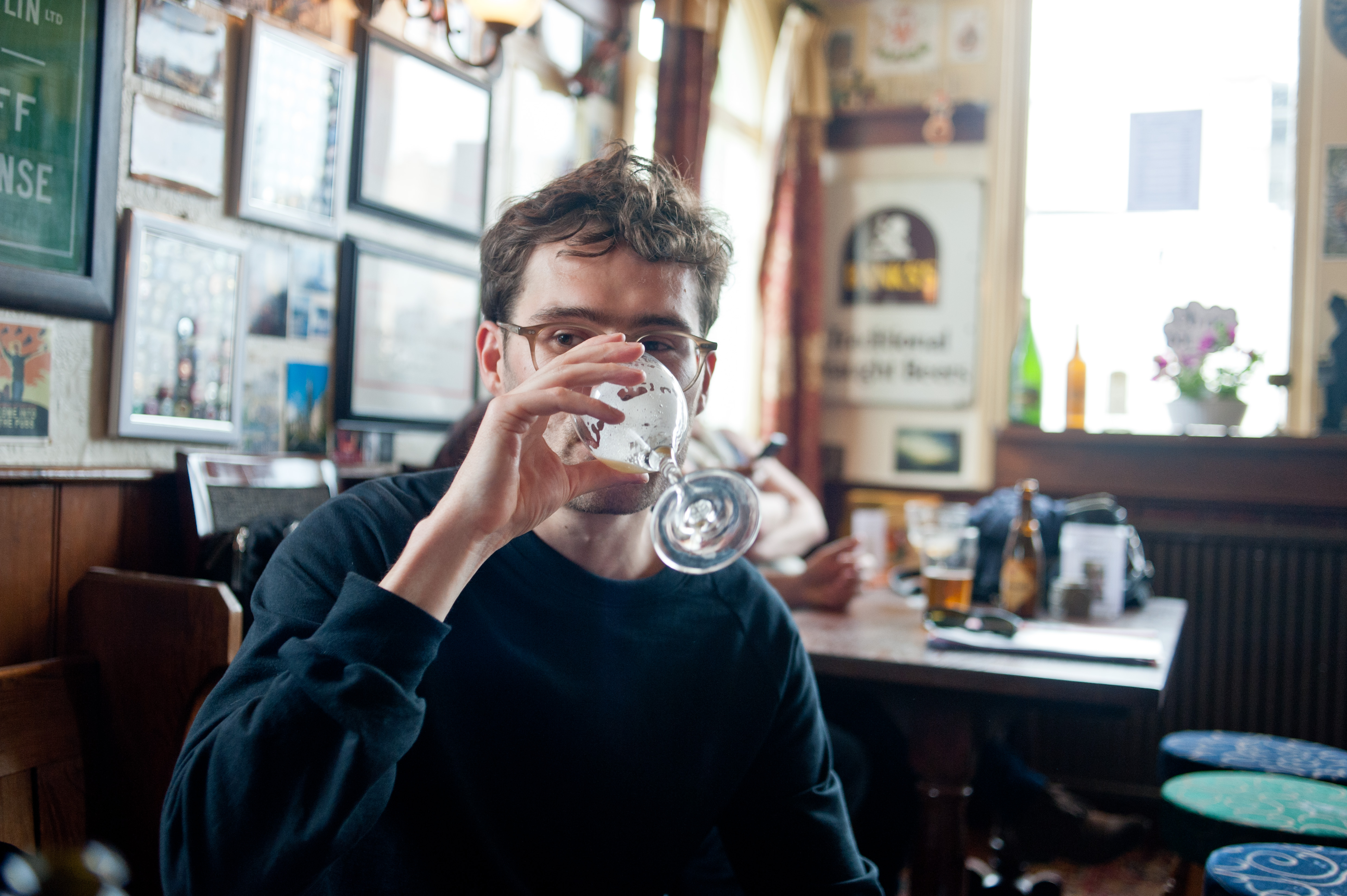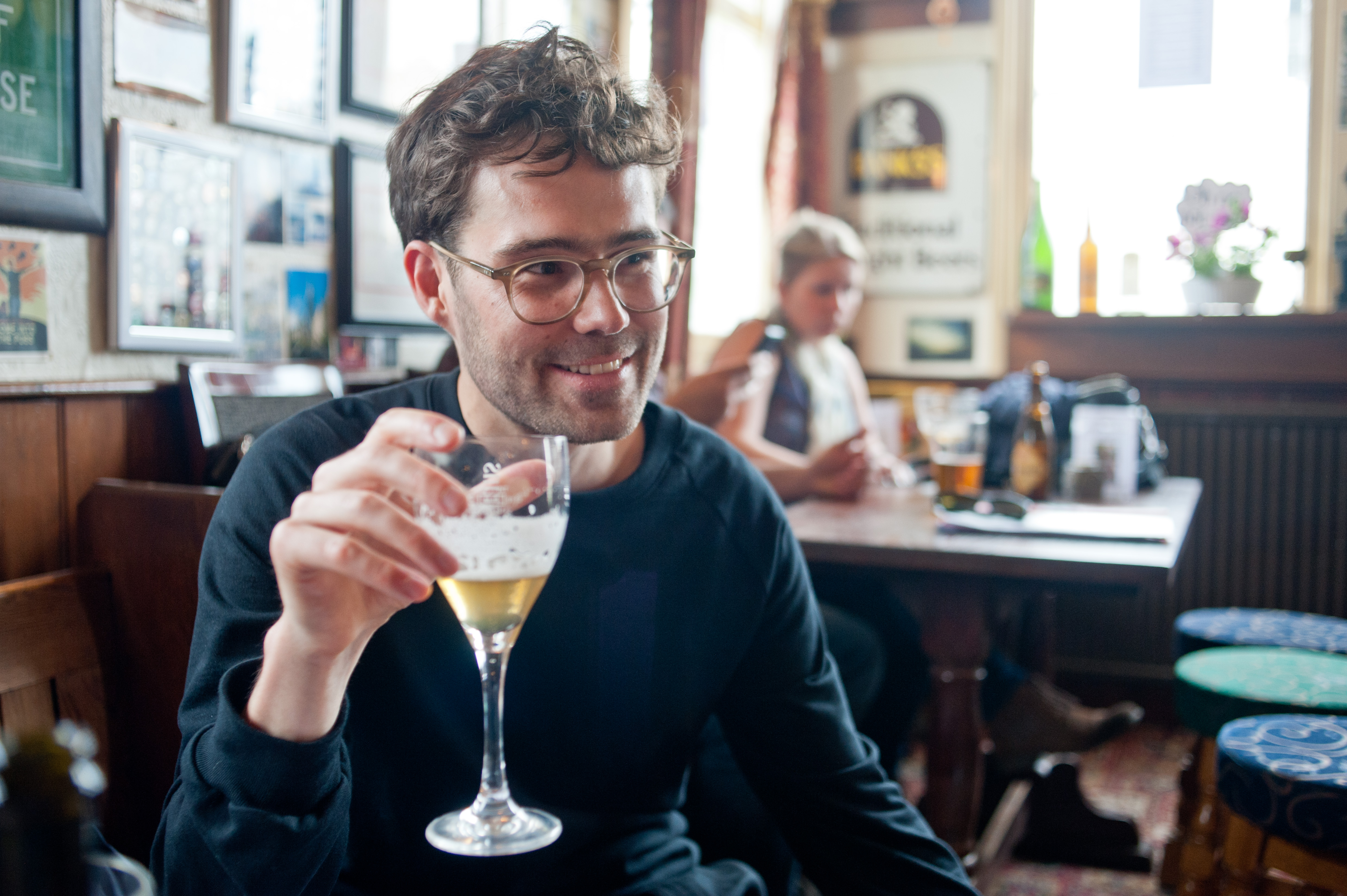 ?Si Barber/07739 472 922 Pub crawling in Cambridge with Sebastian Kempkens. Image shows Sebastian trying Deus, an 11% Belgian beer.