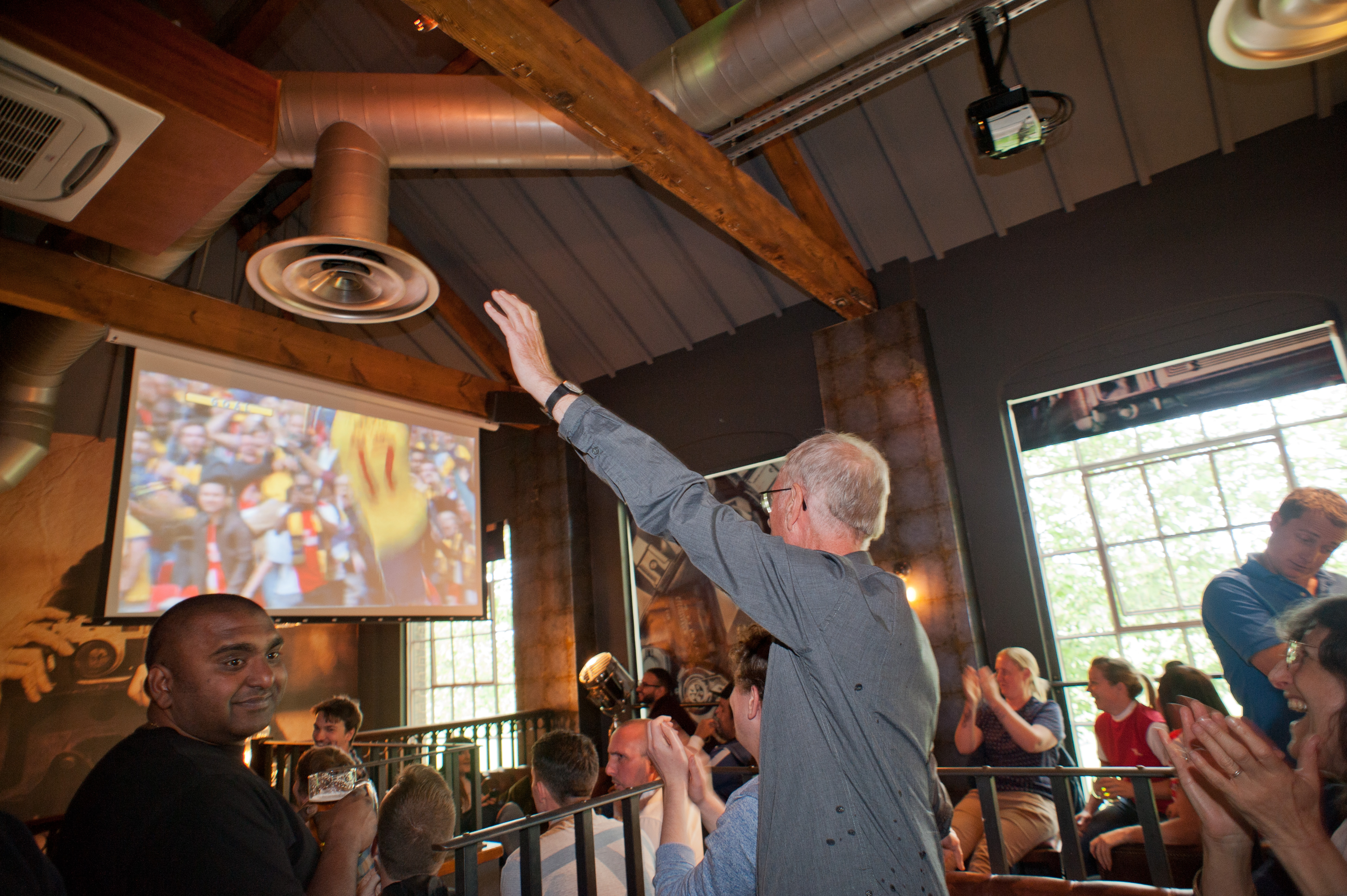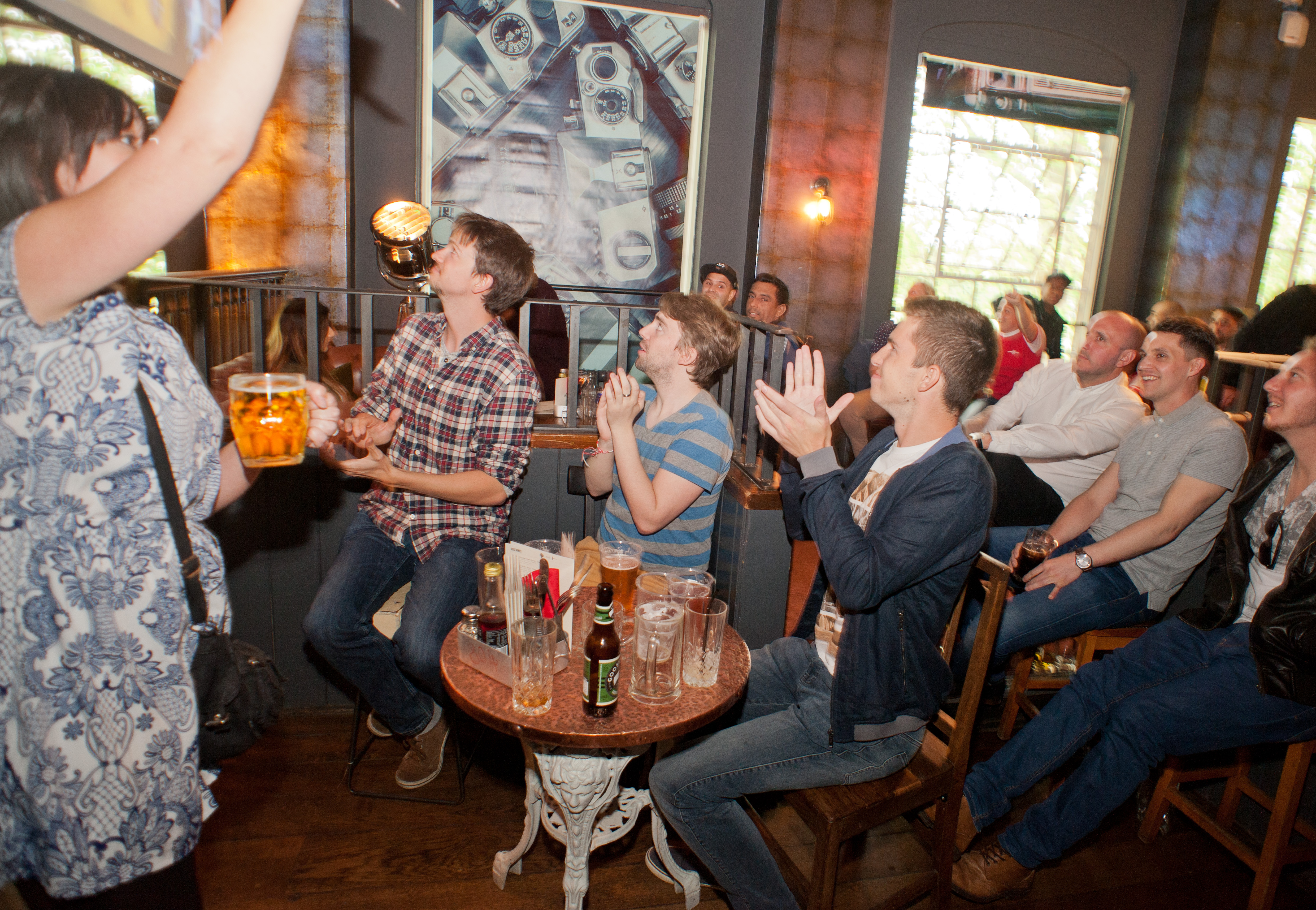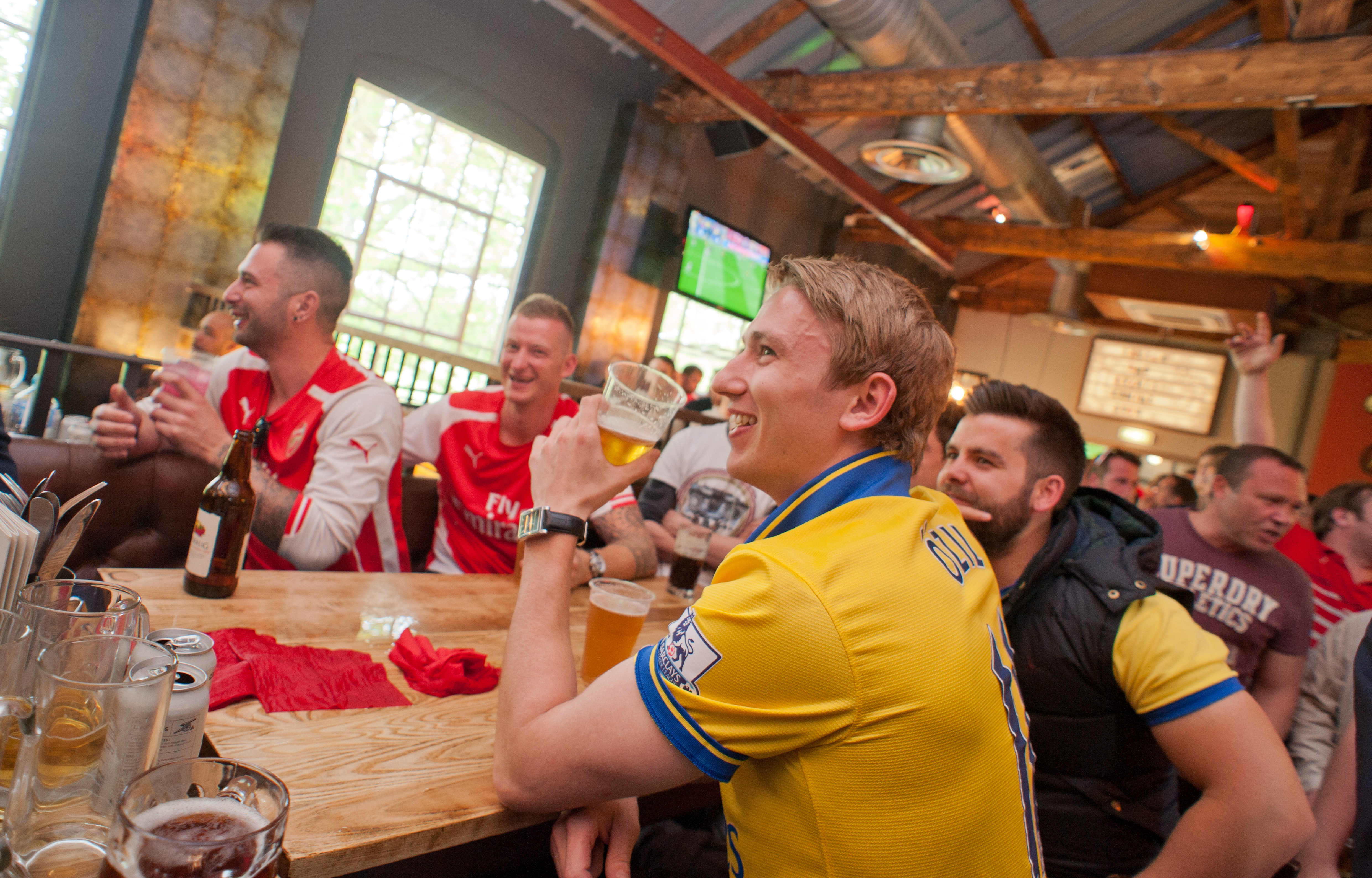 ?Si Barber/07739 472 922 Pub crawling in Cambridge with Sebastian Kempkens. Image shows football fans watching the FA Cup at The Grain Store in Cambridge.