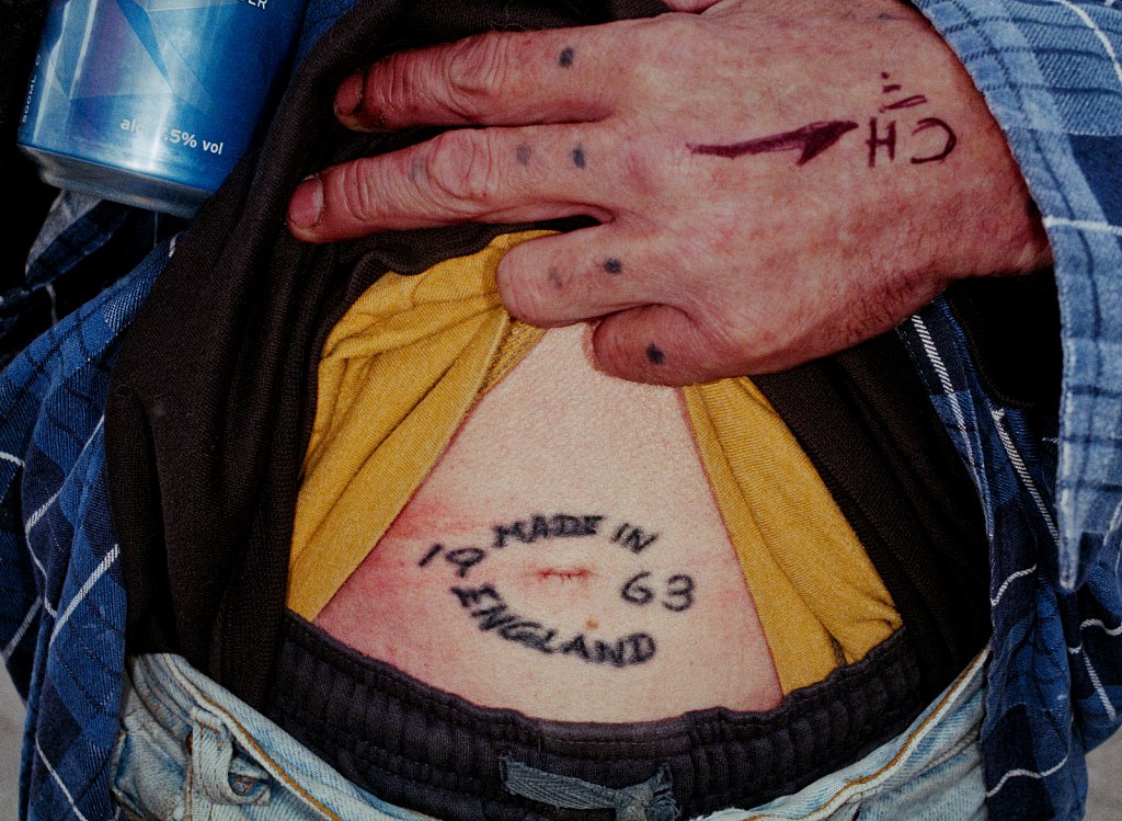 A man with a tattoo on his belly stating ‘made in England 1963’
