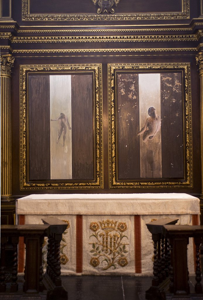 ?Si Barber2010 Tel 07739472922 Tom De Freston's paintings Deposition and Resurrection which form the permanent altarpiece at Christ's Chapel Cambridge. The works which are the first to be commissioned by the college in 500 years depict a pair of naked men floating under water, one apparently sinking and one swimming upwards. They are also unusual in that they depict the human penis.