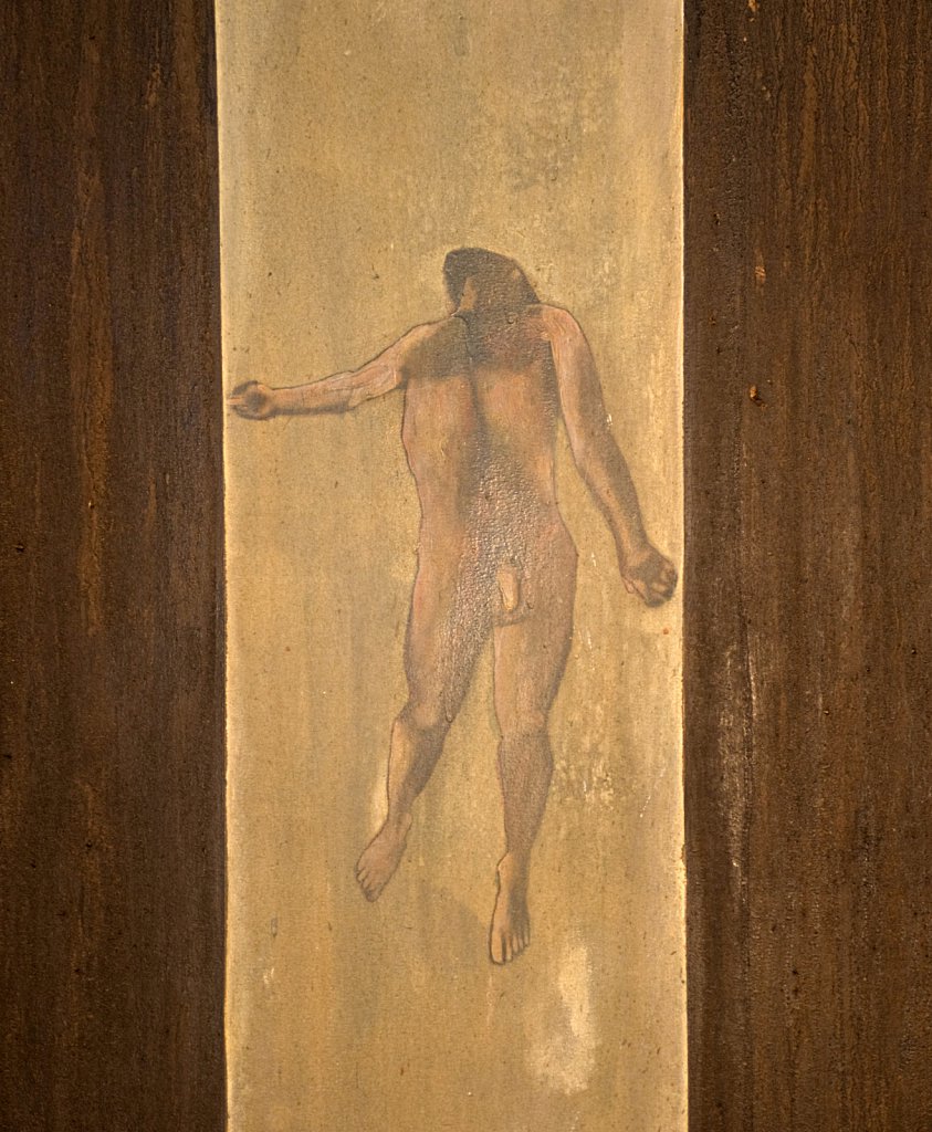 ?Si Barber2010 Tel 07739472922 Tom De Freston's paintings Deposition and Resurrection which form the permanent altarpiece at Christ's Chapel Cambridge. The works which are the first to be commissioned by the college in 500 years depict a pair of naked men floating under water, one apparently sinking and one swimming upwards. They are also unique in that they are depict the male penis .