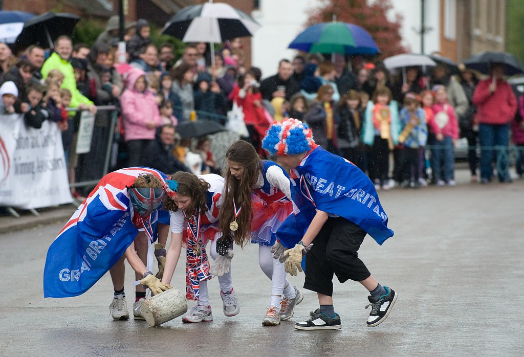 Cheesrolling 2012   ?Si Barber/07739 472 922 Participants competing in the annual Cheeserolling competition in Stilton, Cambridgeshire on a wet bank holiday 2012. The event commemorates the Stilton Cheese which was first produced in the town.