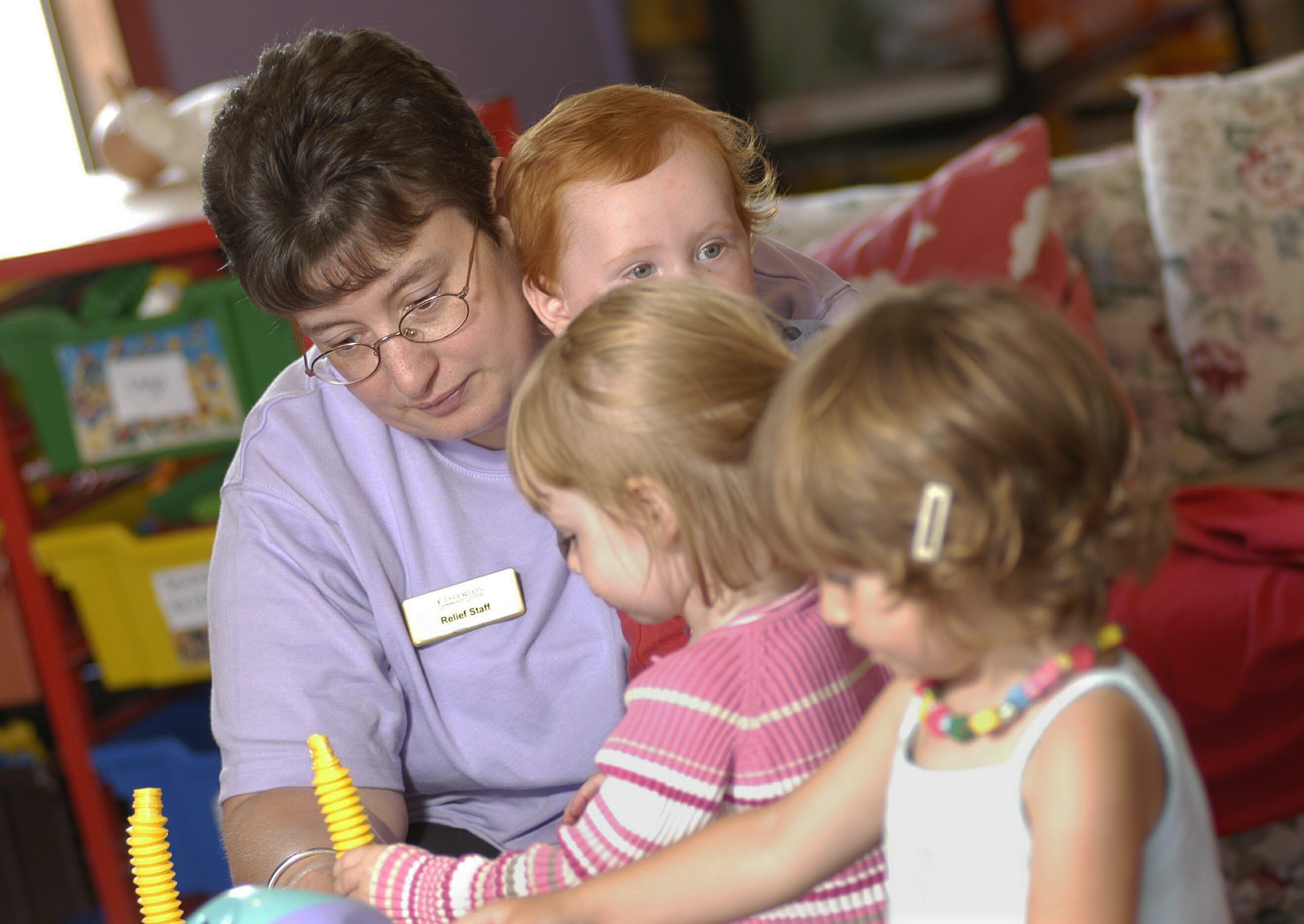 bonding care caring children employees kindergarten learn learning nursery play playgroup playing staff with workers working