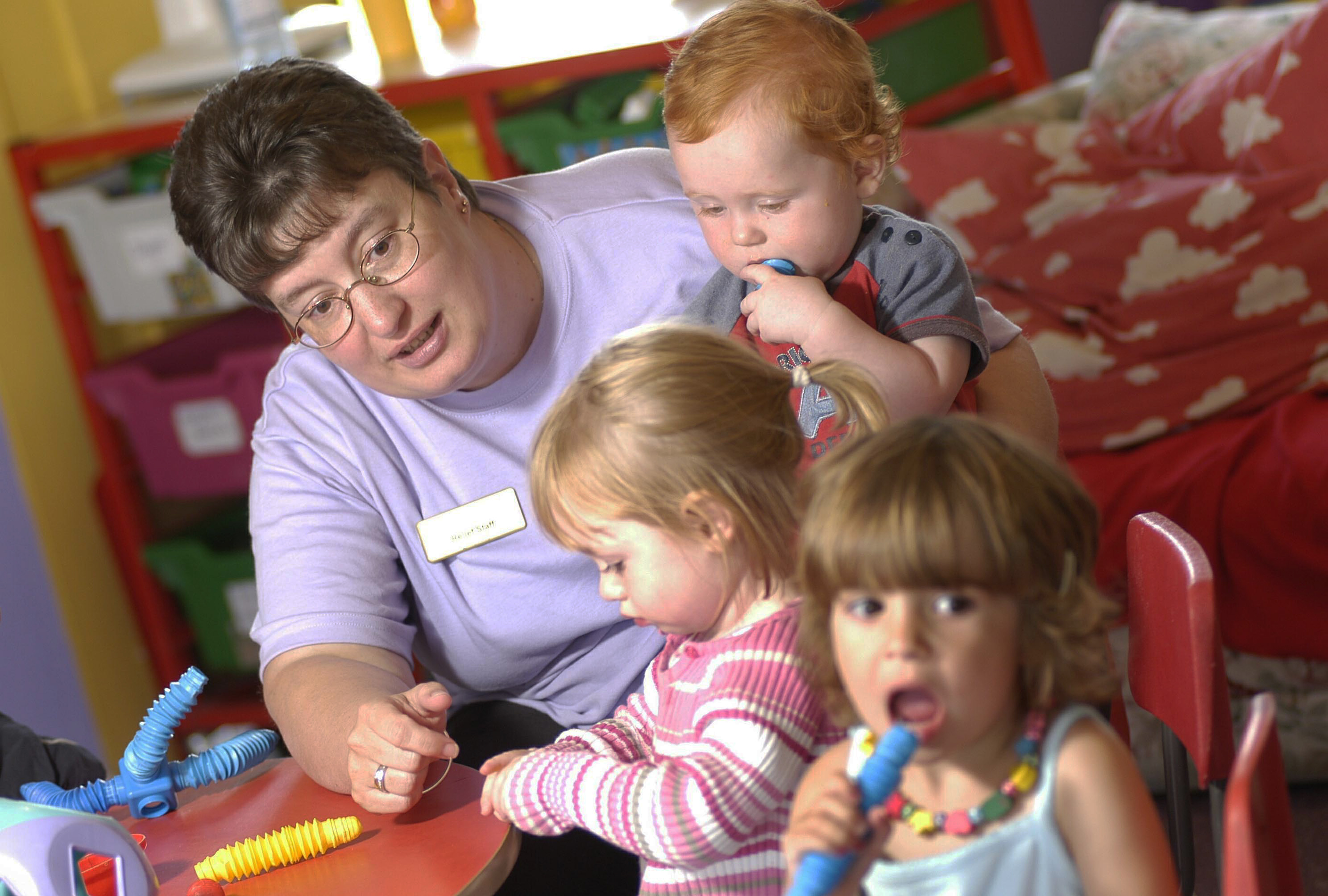 bonding care caring children employees kindergarten learn learning nursery play playgroup playing staff with workers working