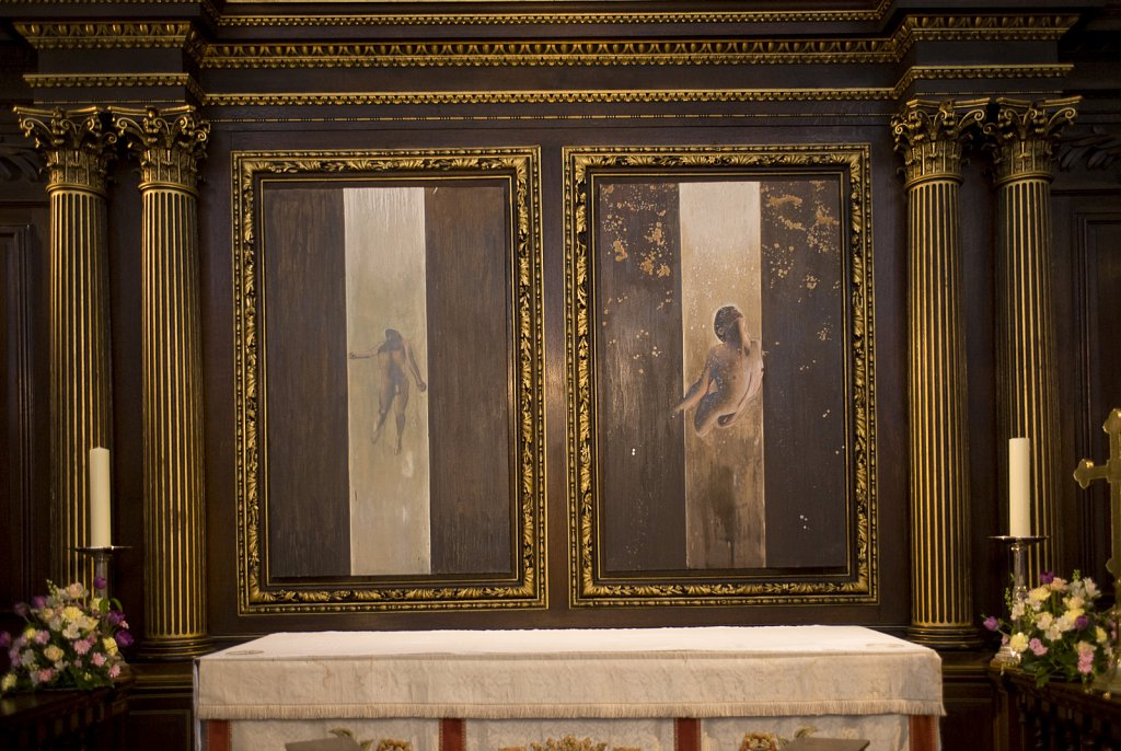 ?Si Barber2010 Tel 07739472922 Tom De Freston's paintings Deposition and Resurrection which form the permanent altarpiece at Christ's Chapel Cambridge. The works which are the first to be commissioned by the college in 500 years depict a pair of naked men floating under water, one apparently sinking and one swimming upwards. They are also unusual in that they depict the human penis.