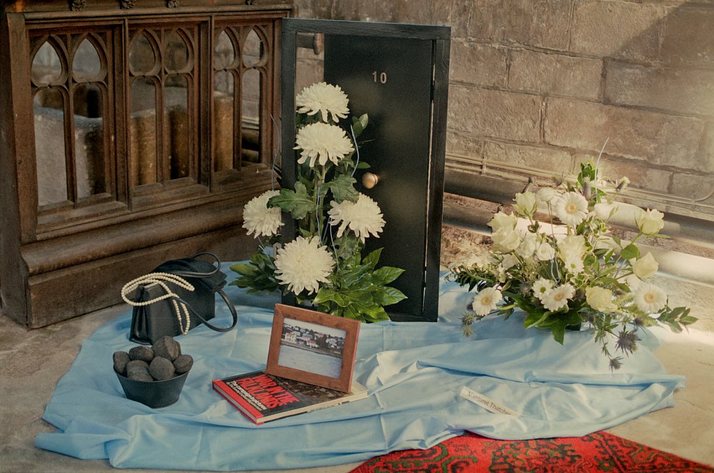 ©Si Barber Moral rights asserted. Tribute to Margaret Thatcher in a Lincolnshire church, featuring coal, a handbag and a book on the Flaklands war.