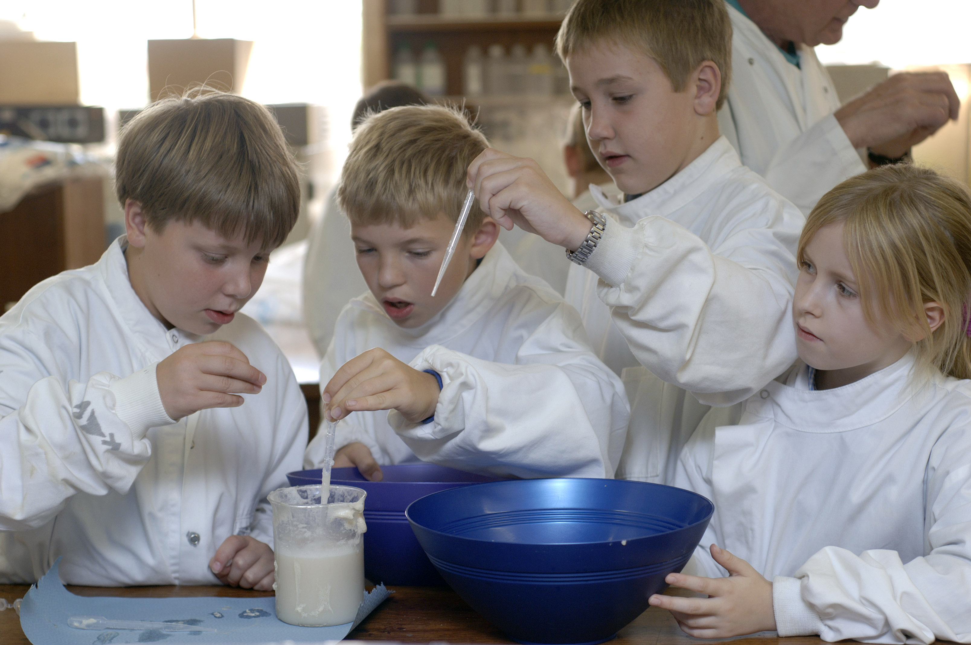 boys children class coats experiment girls micropscope primary pupils school science scools study studying white