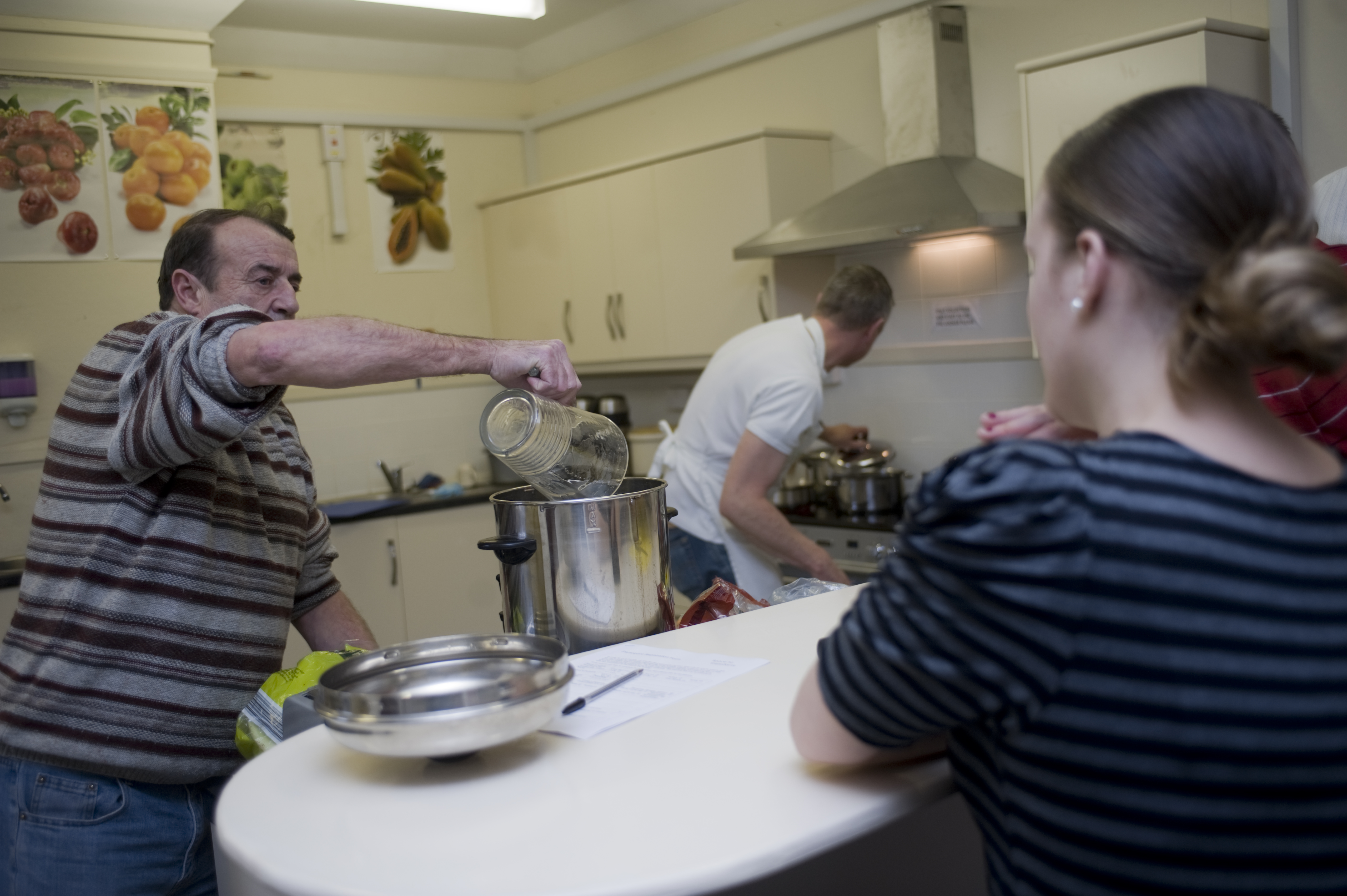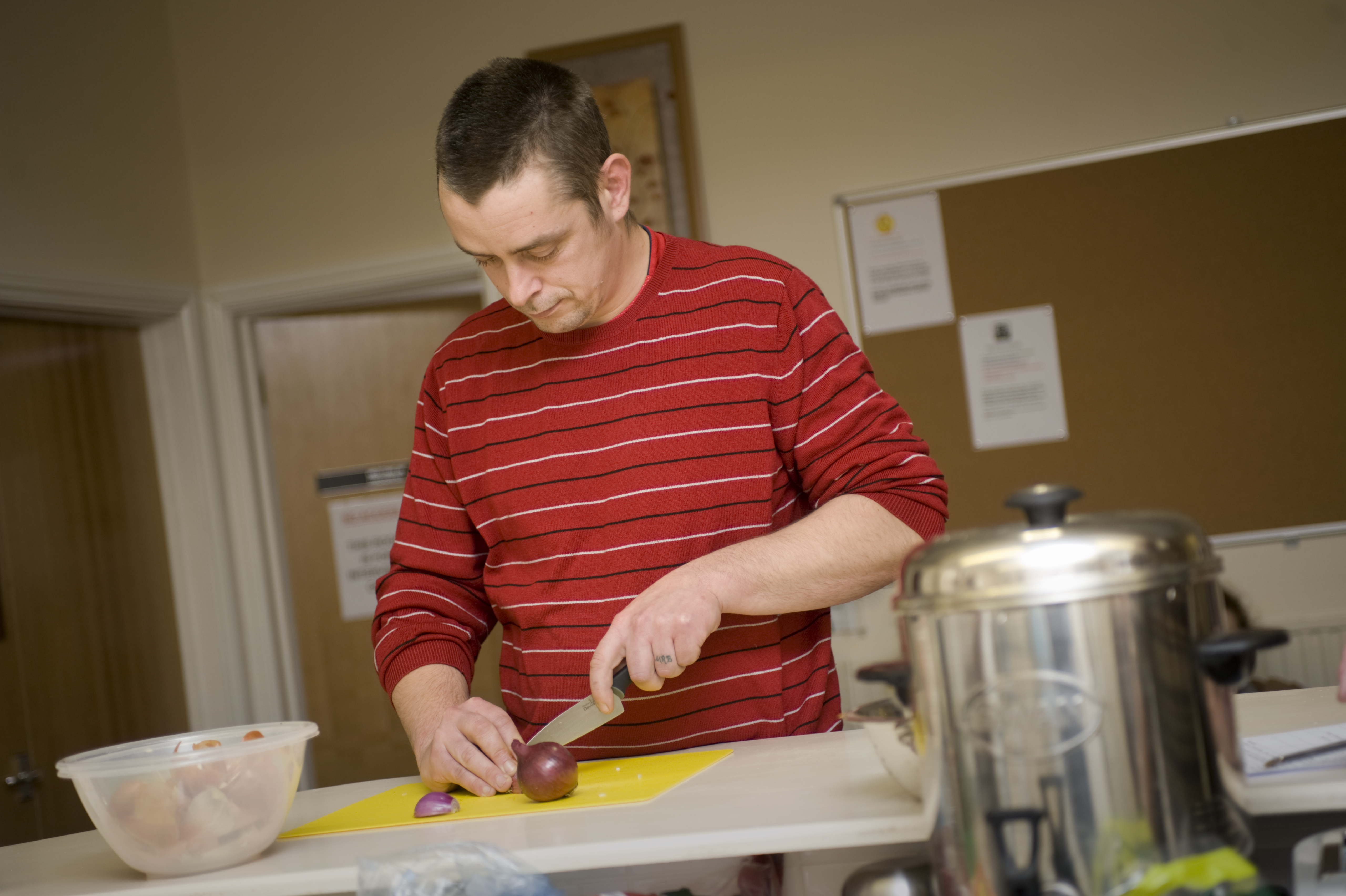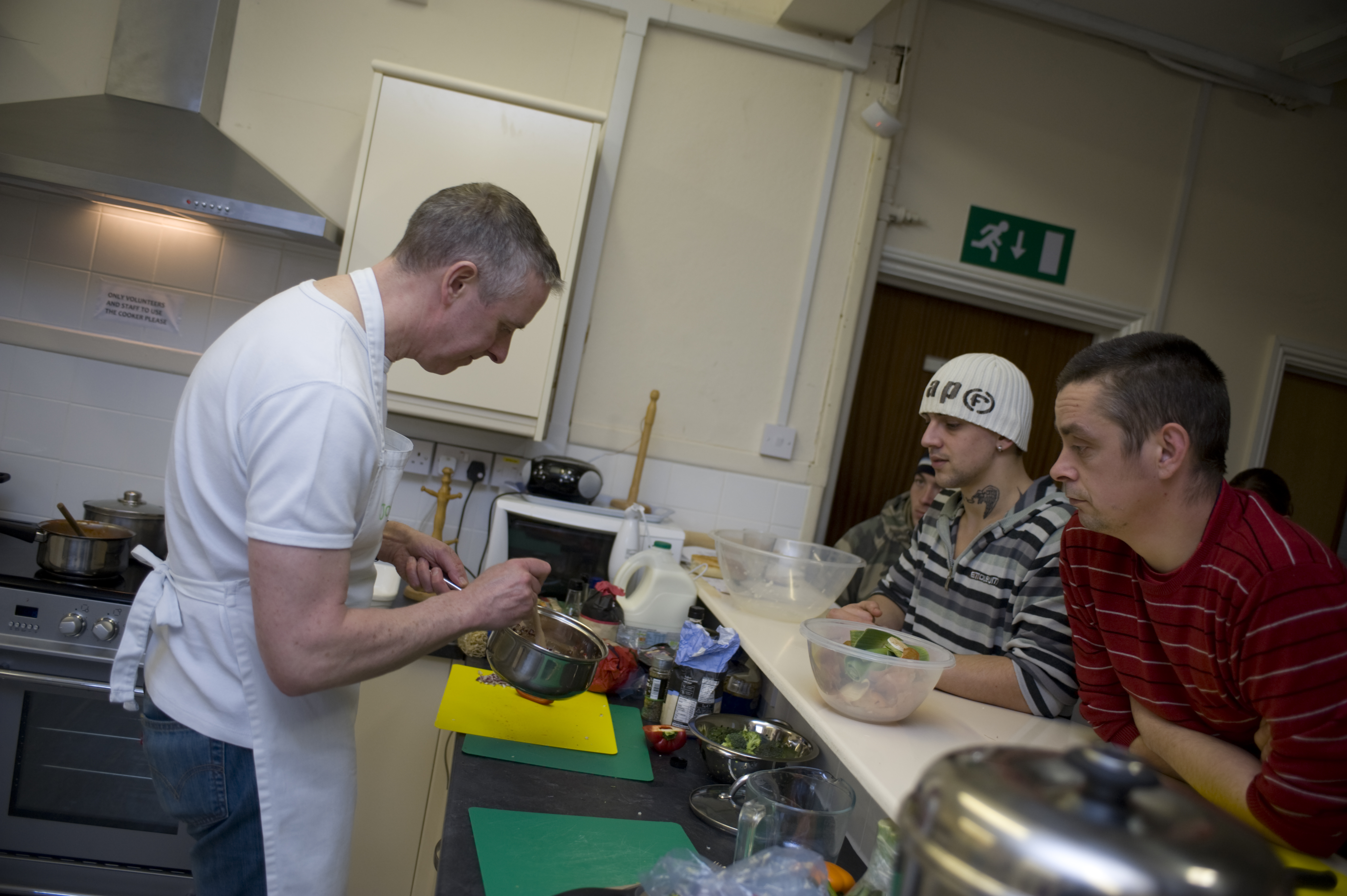 Homeless people at a shelter being taught cookery skills and healthy eating habits.