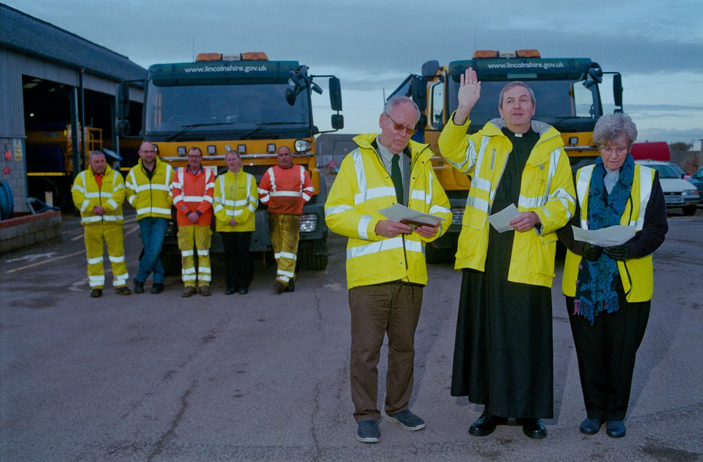 The Reverend Ian Cuthbertson of Gosberton Church with the Rev Frances Ballantyne and the Rev Steve Weatherly-Barton blessing the Council gritters at Pode Hole Depot, Linconshire where prayers are given for the safety of drivers during the Winter months before the gritting vehicles set off to deposit salt on the county's roads to combat the icy conditions.